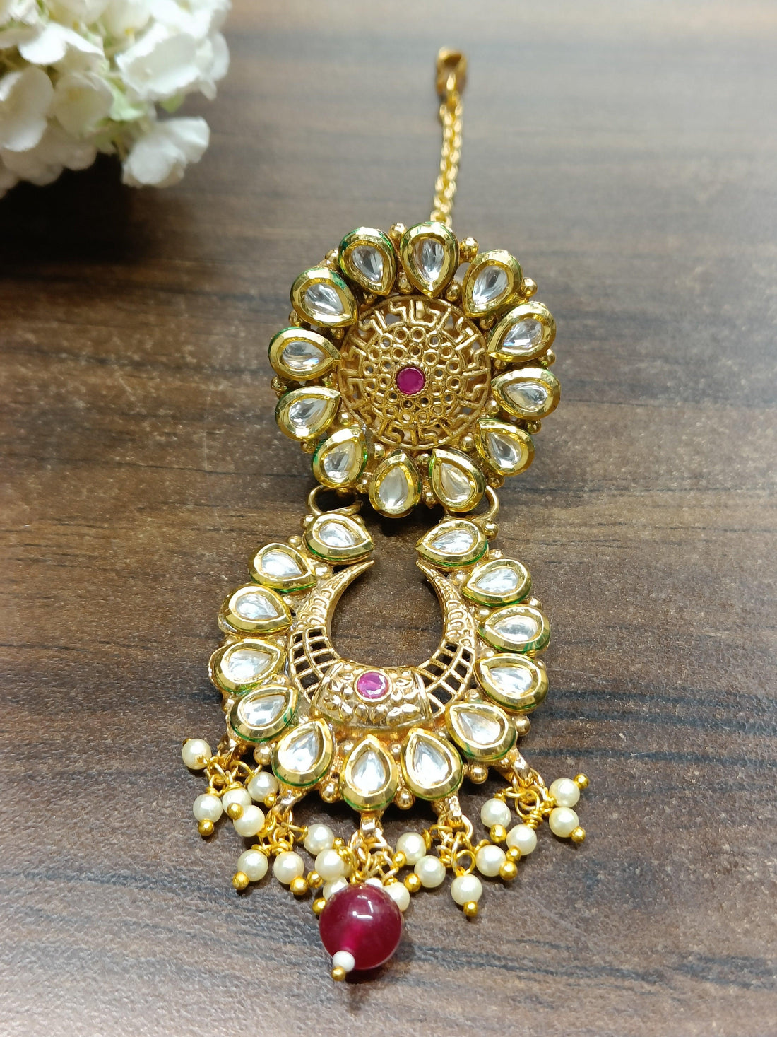 Maang Tikka For Wedding This Beautiful traditional Kundan and pearl with red and green stone...