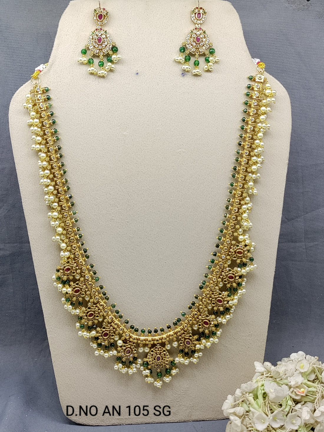 Pearl Polki Long Necklace Mehndi Set Sku-6137 B3