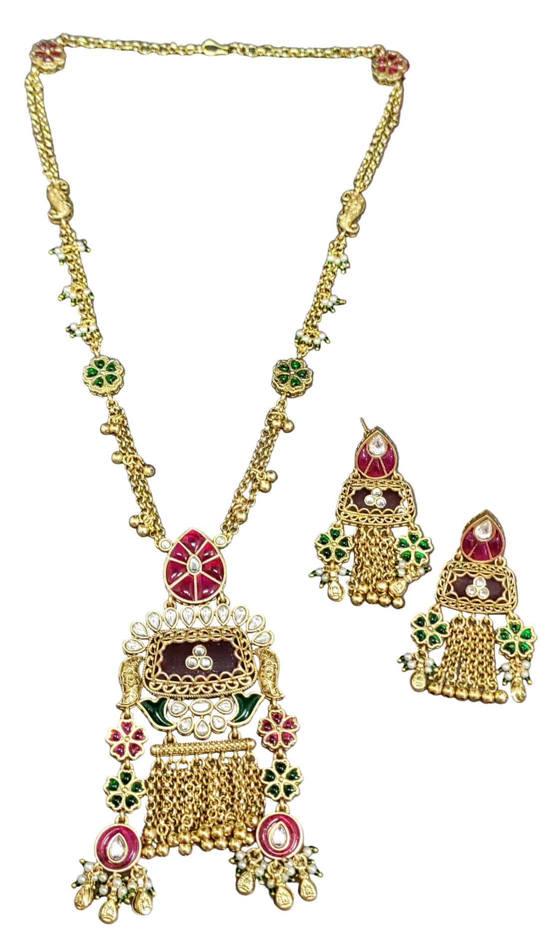 The Antique Golden Kundan Long Set combines traditional Kundan artistry with elegant pearl embellishments, creating...