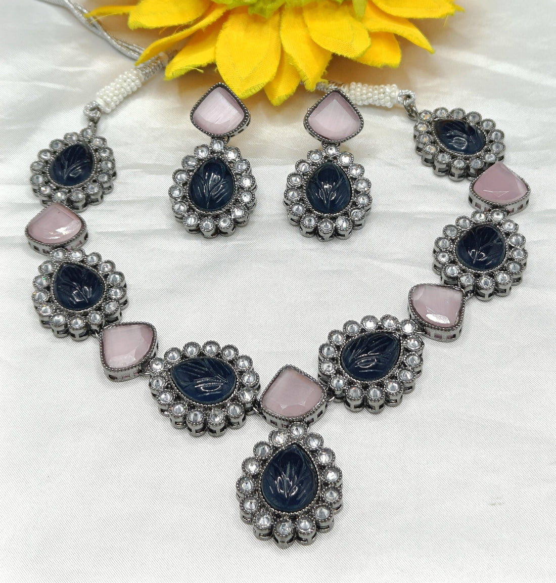 Victorian Black finished oxodised Polki Earrings. Crafted with a beautiful pink and mint color beads...