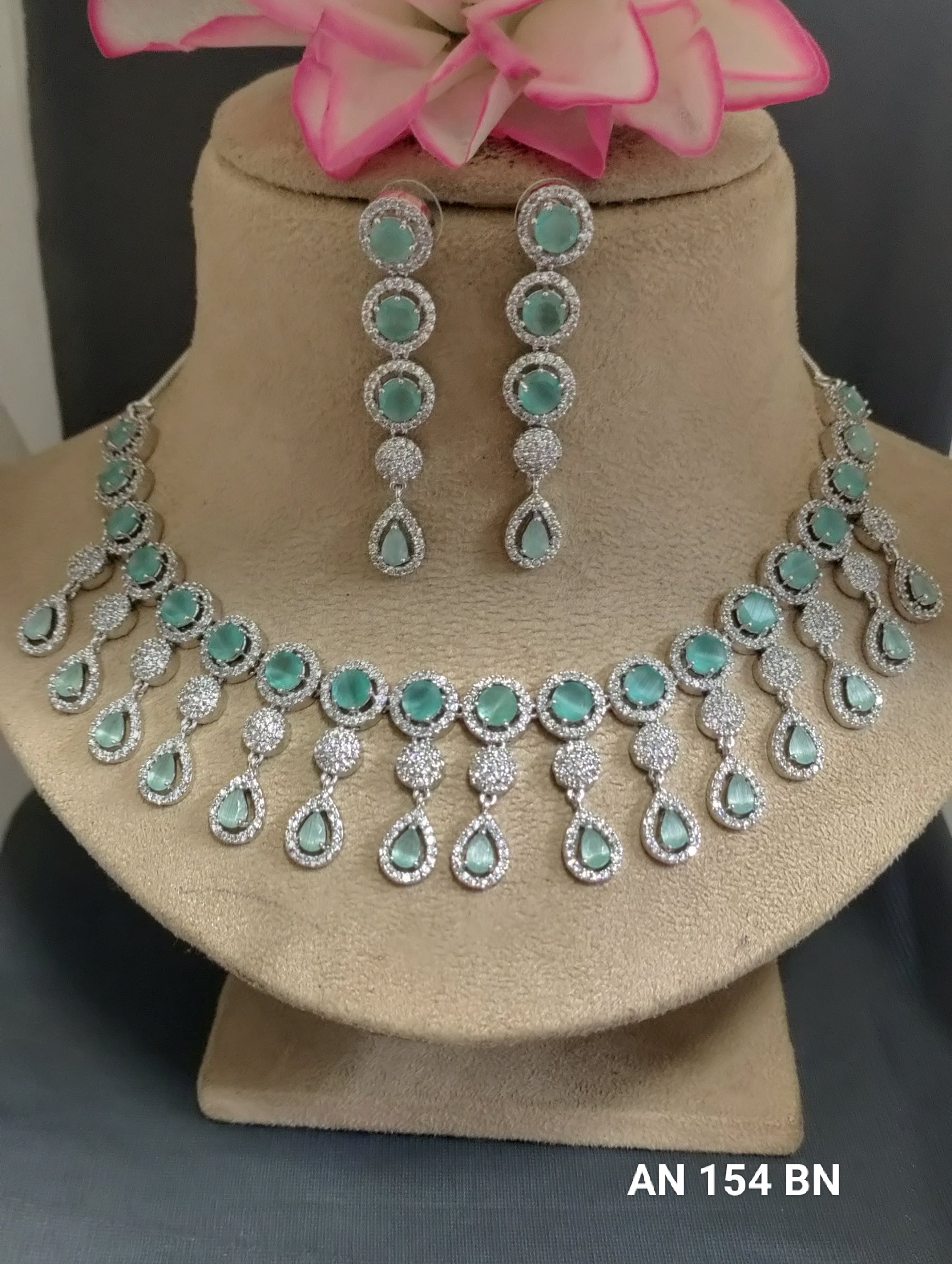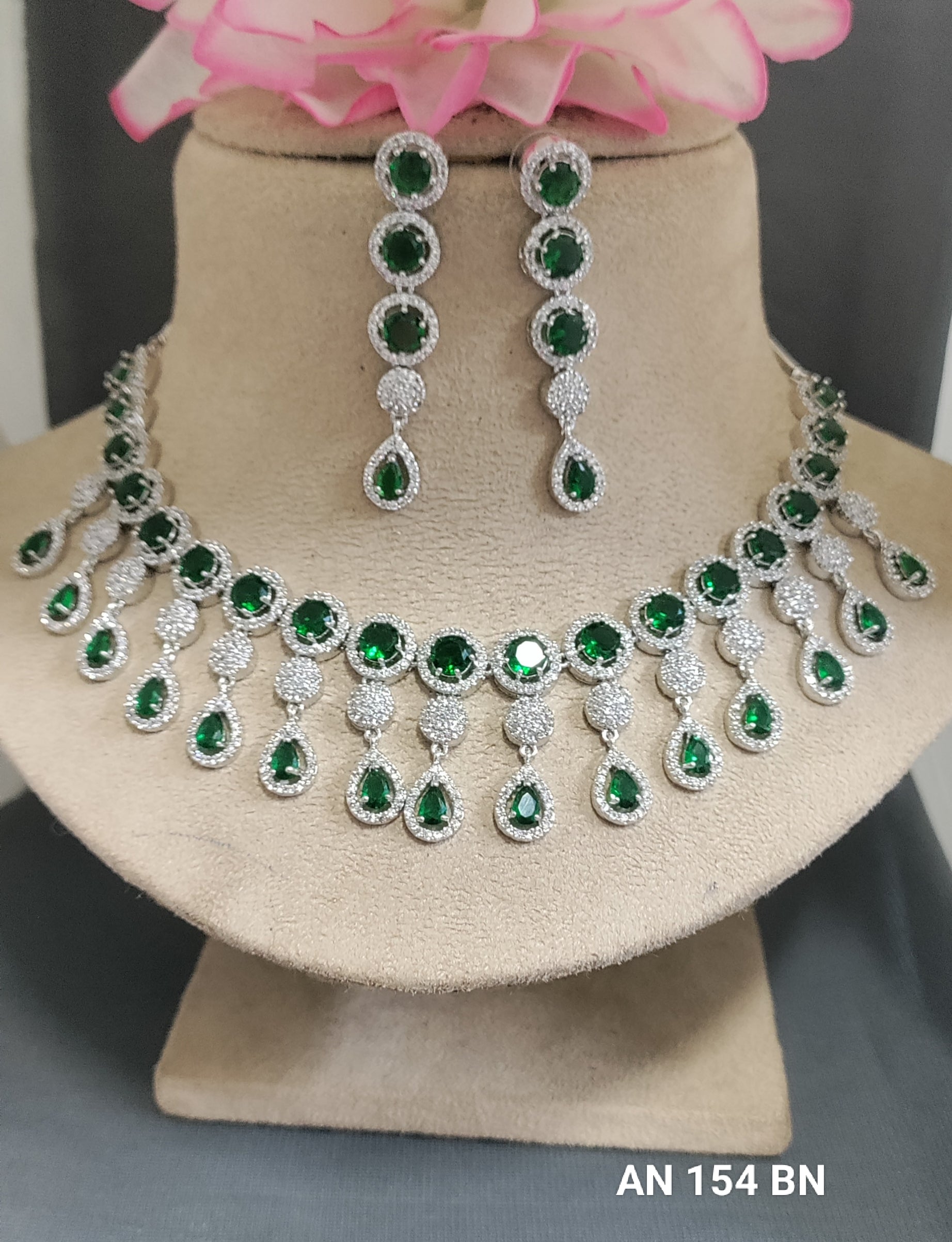 American Diamond Necklace Rodium, Made with high-quality American diamonds, this necklace is sure to elevate any outfit. With its durable rodium coating, it will maintain its shine for years to come. Perfect for adding a touch of elegance and sparkle to any look. Available color like Green,Mint,White