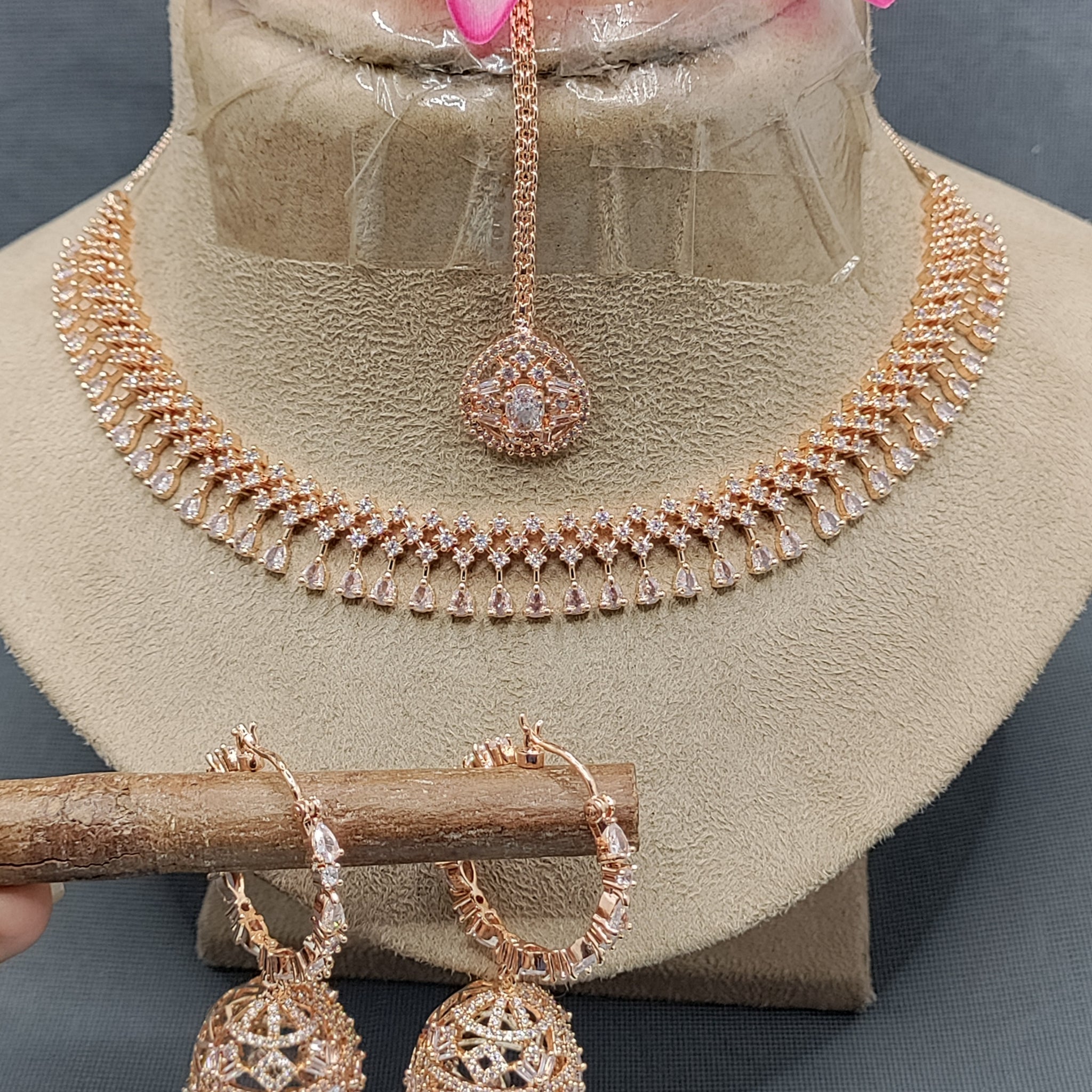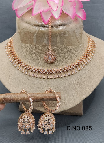 This American Diamond Rose gold Necklace (sku 085 SR) features sparkling CZ stones and a stunning Rosegold finish. Perfect for adding a touch of elegance to any outfit. Made with high quality materials, this necklace is sure to make a statement at any event.