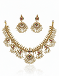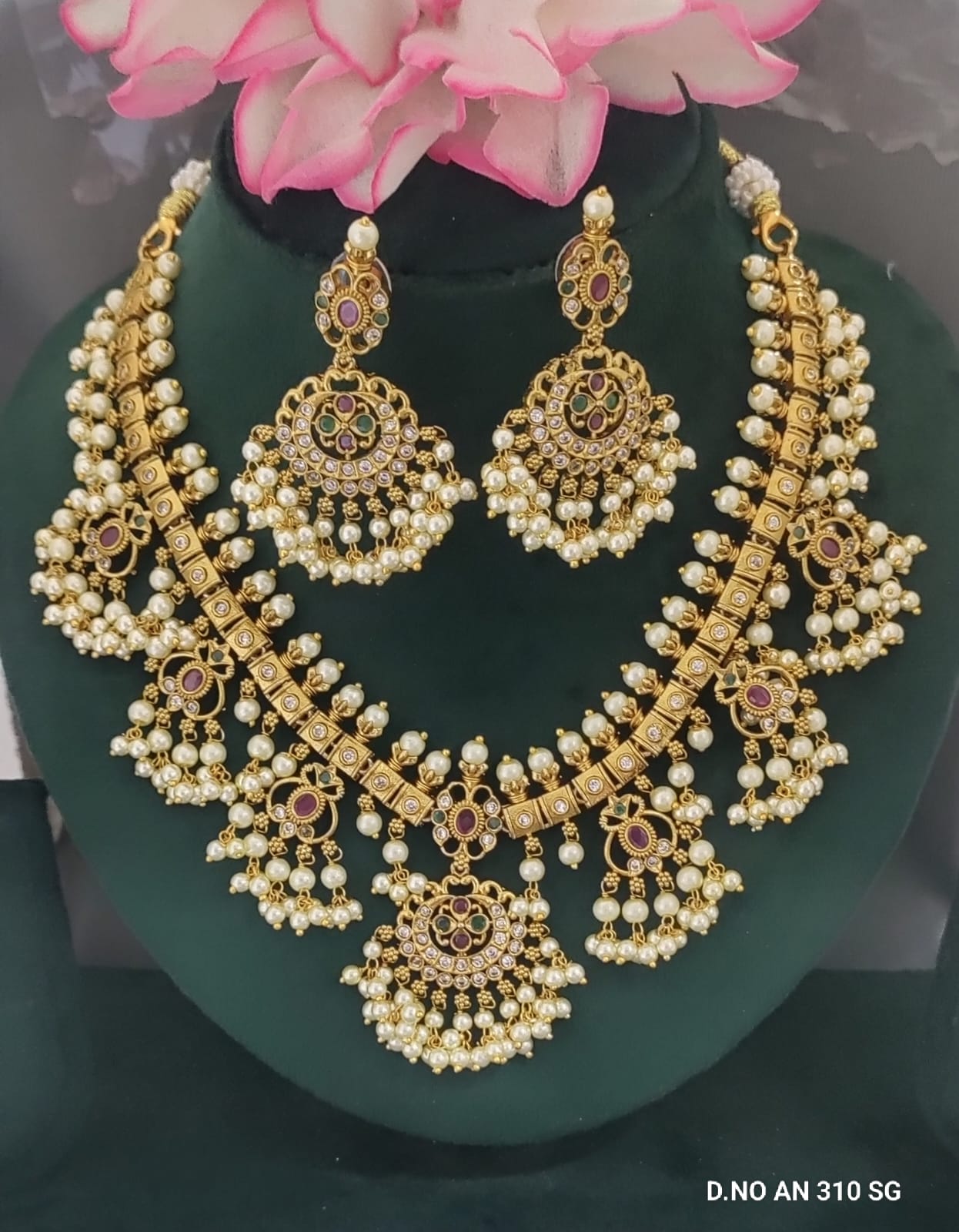 Antique Golden Necklace (SKU AN 310 SG) showcases intricate craftsmanship inspired by traditional temple jewelry designs. Its rich golden finish lends an authentic, timeless appeal, perfect for enhancing ethnic and festive ensembles. Expertly crafted to reflect heritage artistry, this necklace adds a regal touch, making it an ideal choice for special occasions that celebrate culture and elegance.
