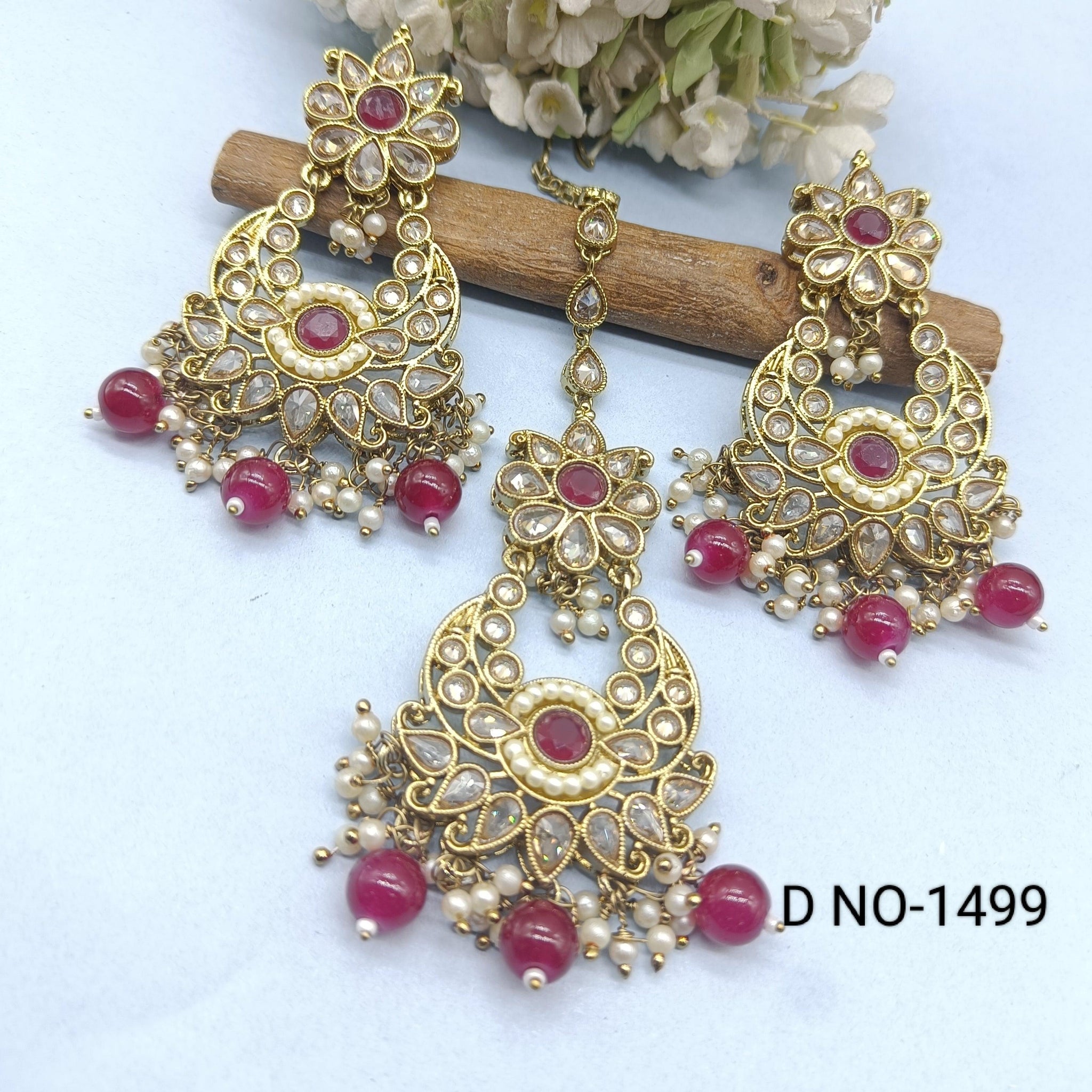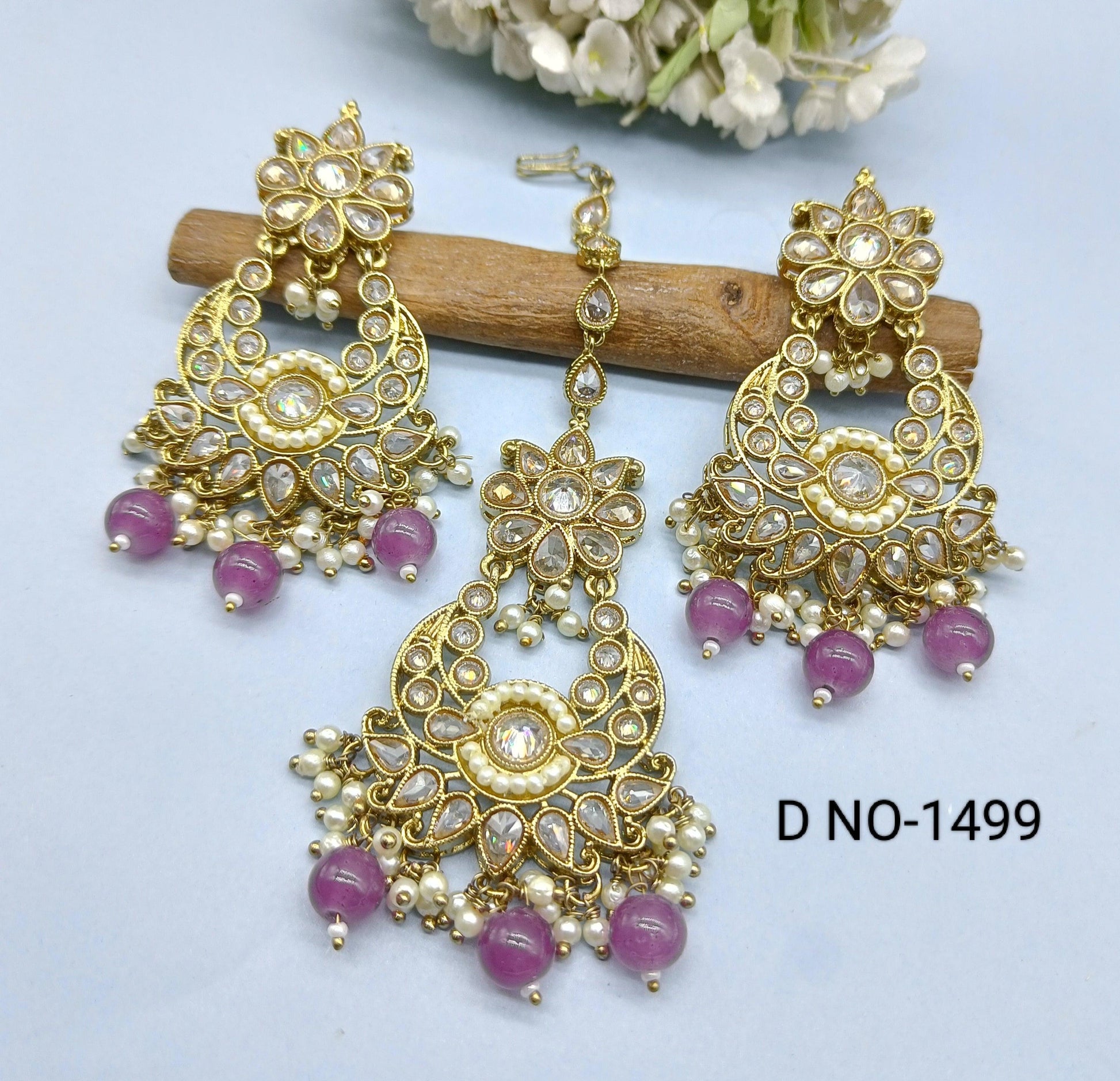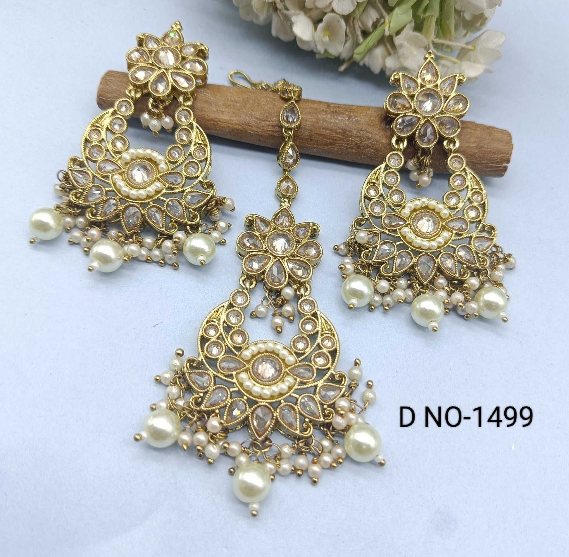 Antique Golden Polki Earrings-Tika Sku-1499 A2. These earrings feature a stunning antique golden design with intricate polki detailing. The perfect addition to any outfit. Made with high-quality materials.