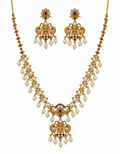 Antique Golden Temple Necklace (SKU AN 309 SG) showcases intricate craftsmanship inspired by traditional temple jewelry designs. Its rich golden finish lends an authentic, timeless appeal, perfect for enhancing ethnic and festive ensembles. Expertly crafted to reflect heritage artistry, this necklace adds a regal touch, making it an ideal choice for special occasions that celebrate culture and elegance.