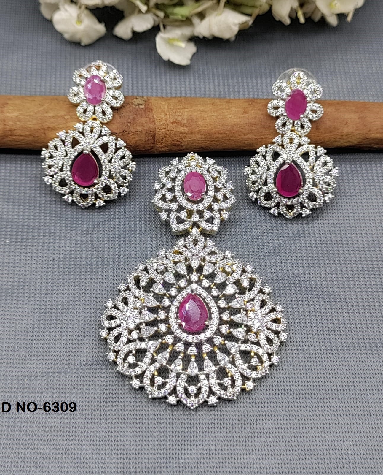AD CZ Earring and Pendant set worn by women of the Indian subcontinent.Elegant and versatile.this pendle set is perfect daily wear or office wear. Also an ideal option for gifting.available in color