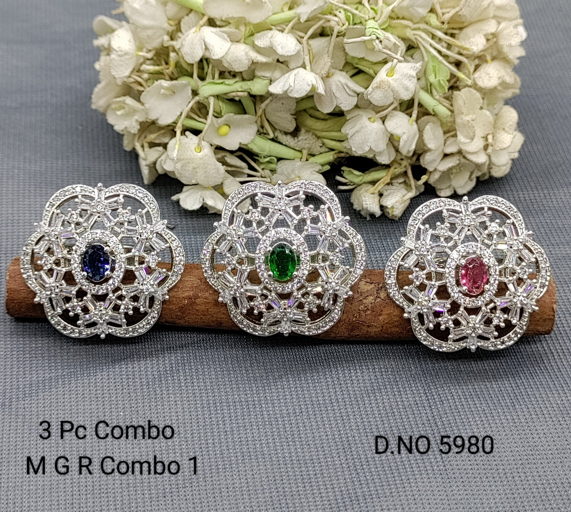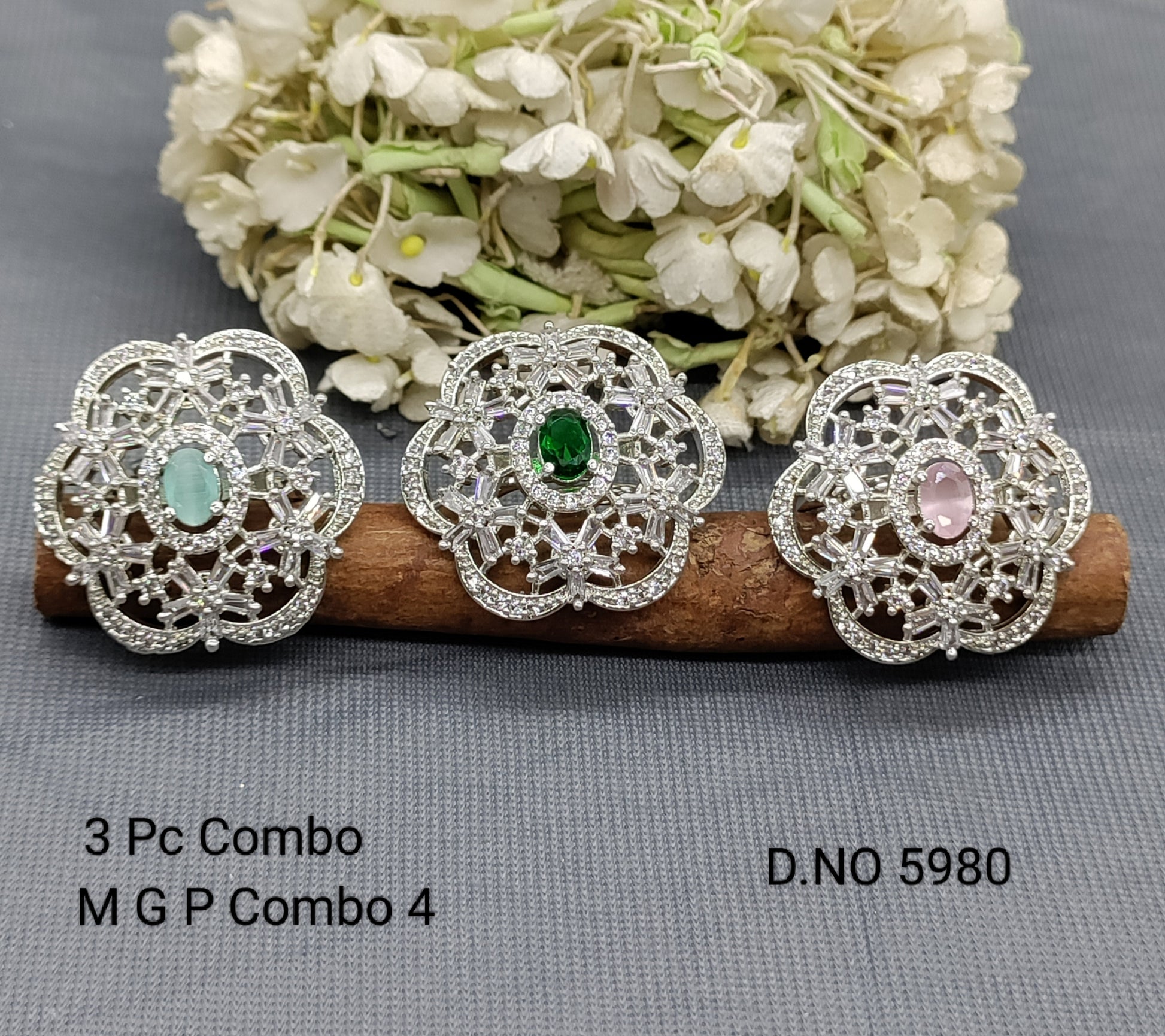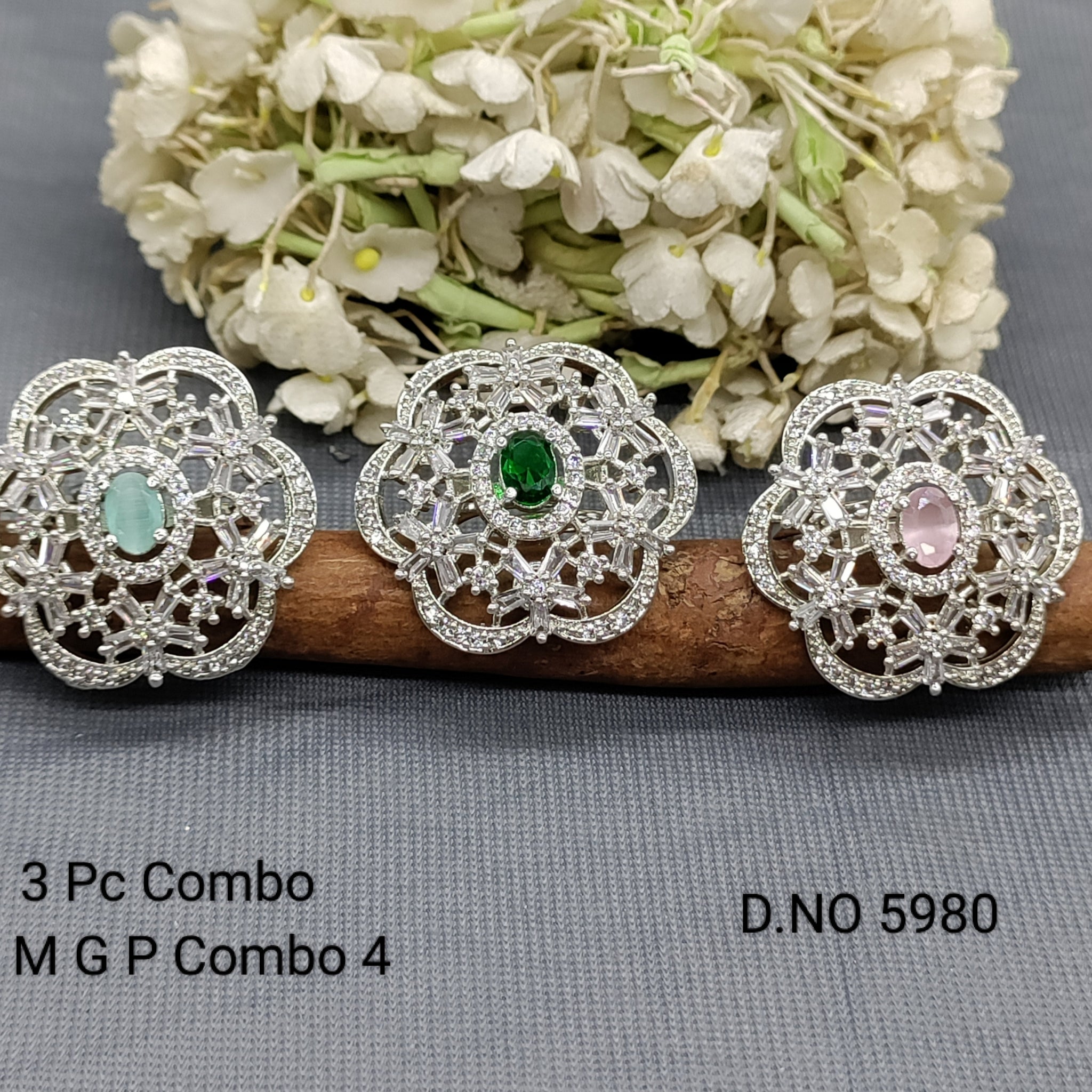 This Cz ad Rodium Finger Ring 3 Pc combo pack (sku 5980) is perfect for adding a touch of elegance to any outfit. Made with stunning cubic zirconia and featuring a beautiful rhodium finish, these rings are sure to make a statement. A must-have for any fashionable individual.