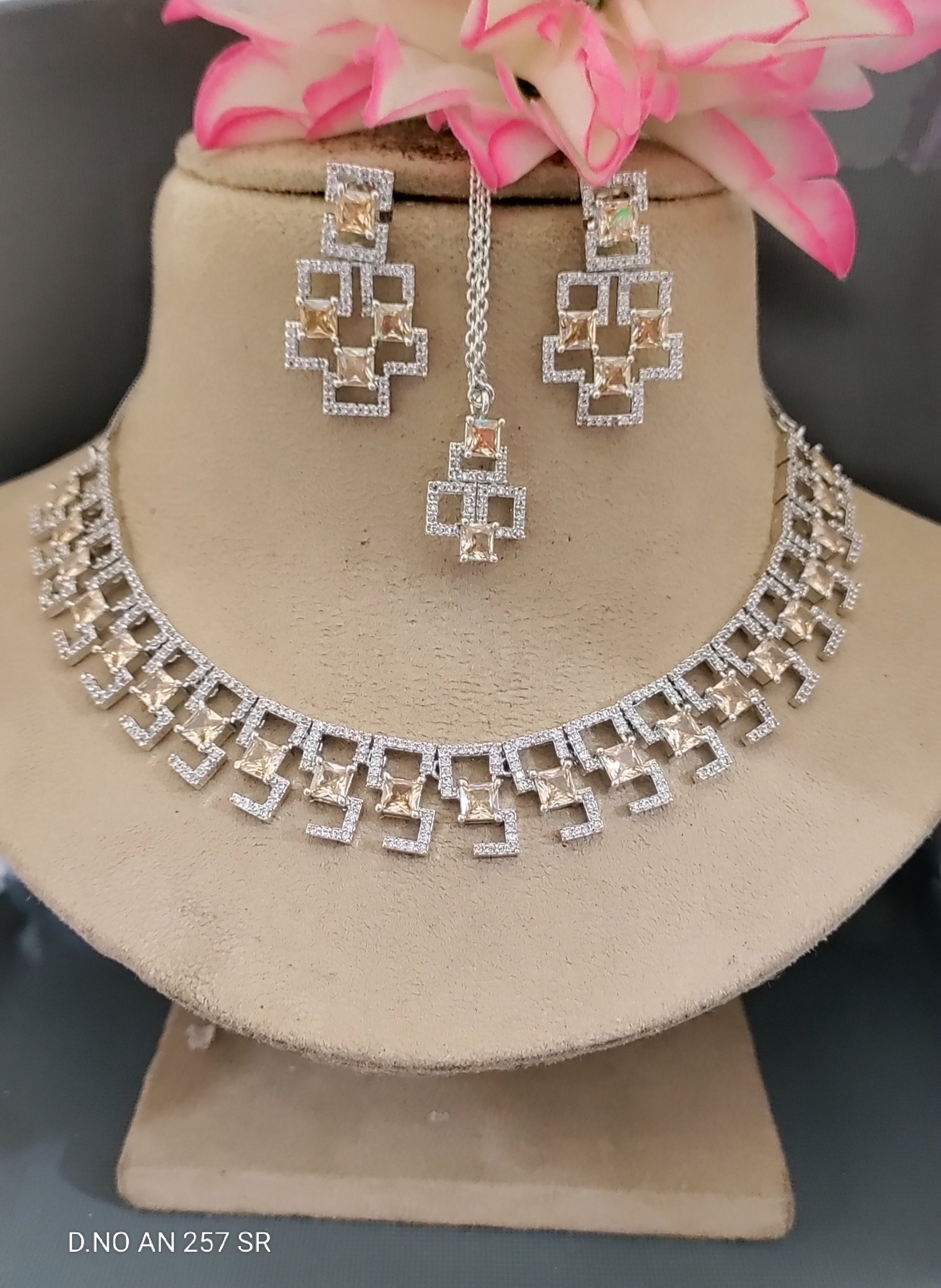 This CZ AD Rhodium Necklace (SKU AN 257 SR) combines the brilliance of cubic zirconia stones with the durability of rhodium plating. Expertly crafted, it offers a radiant, tarnish-resistant finish that enhances any outfit with a sophisticated sparkle. Ideal for those seeking elegant jewelry with lasting shine and refined design.