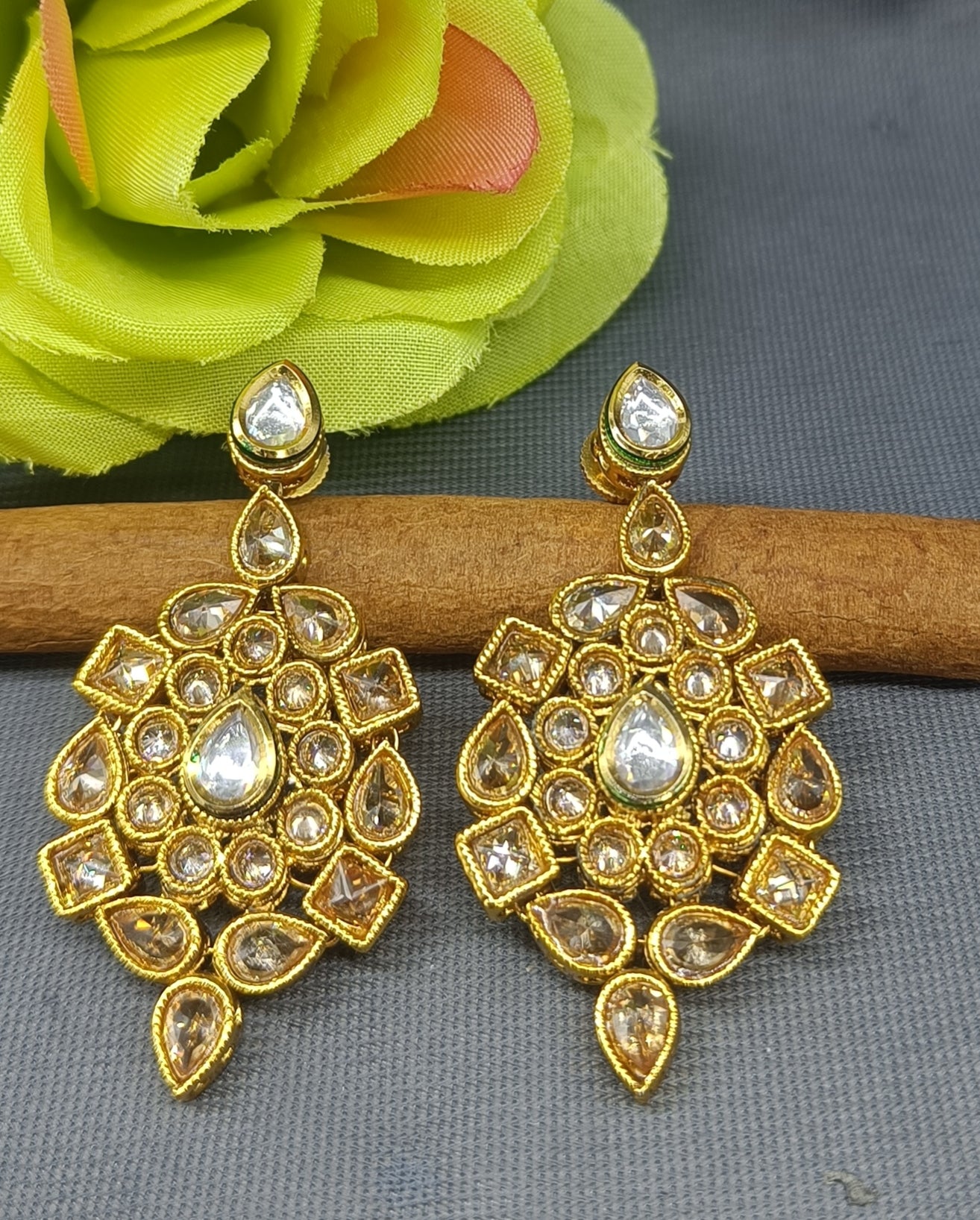 Elevate your jewelry collection with these exquisite Golden Kundan Earrings. Expertly crafted, they showcase traditional Kundan artistry with a radiant golden finish, perfect for adding a touch of timeless elegance to any outfit. Ideal for special occasions, these earrings combine classic design with refined craftsmanship to enhance your style effortlessly.