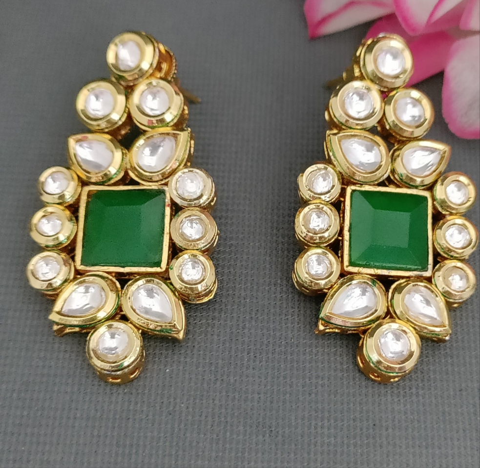 Golden Kundan Earrings showcase intricate craftsmanship with carefully set kundan stones, offering a timeless elegance suitable for both traditional and modern attire. The rich golden finish enhances their luxurious appeal, making them an excellent choice for special occasions or festive wear. .