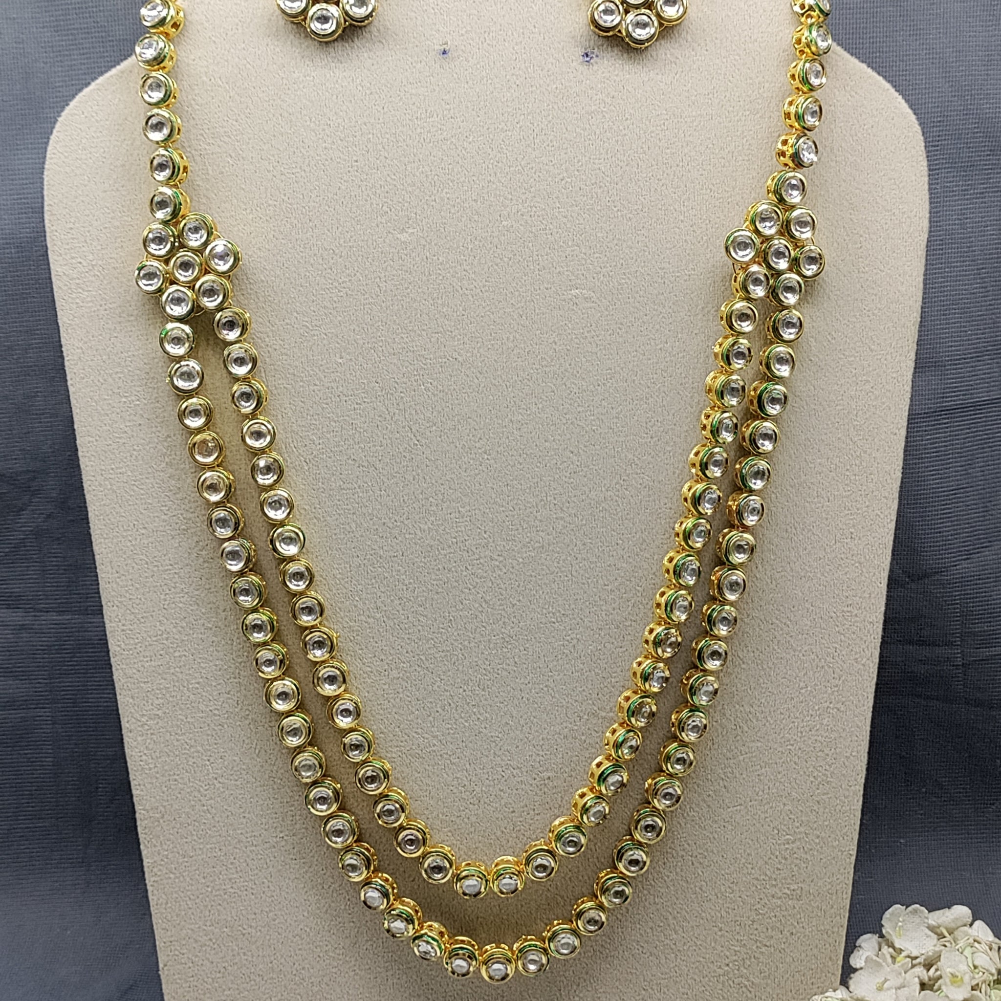 Golden Kundan long Necklace Set is a must-have for any formal occasion. The intricate Kundan design adds a touch of elegance, while the gold color exudes luxury. Made with high-quality materials, this necklace set will make a statement and elevate your outfit.