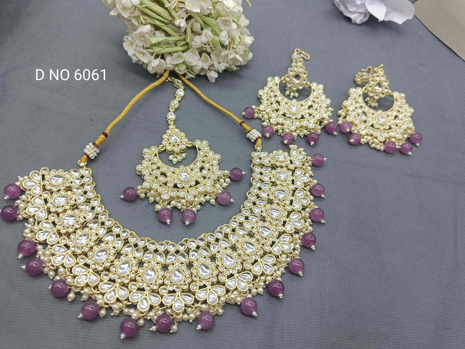 Kundan necklace tikka with earrings . pearl bead work. Thread gonda in necklace and Push back in Earings and very light weight.
