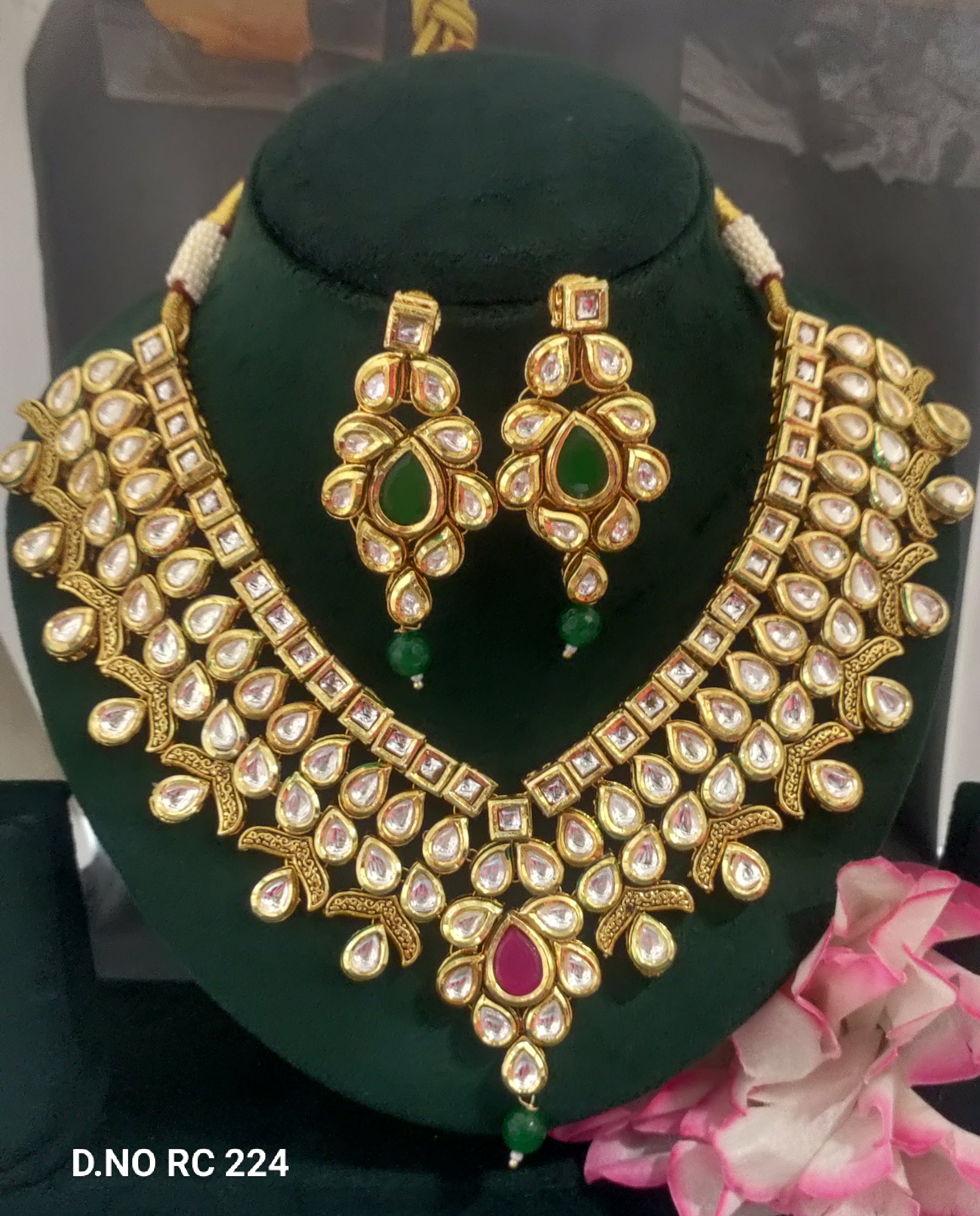 Golden Kundan Necklace Set, expertly crafted to showcase traditional artistry. This set features meticulously set kundan stones on a lustrous golden base, offering a timeless appeal. Perfect for special occasions, it enhances any attire with its refined charm and intricate detailing.