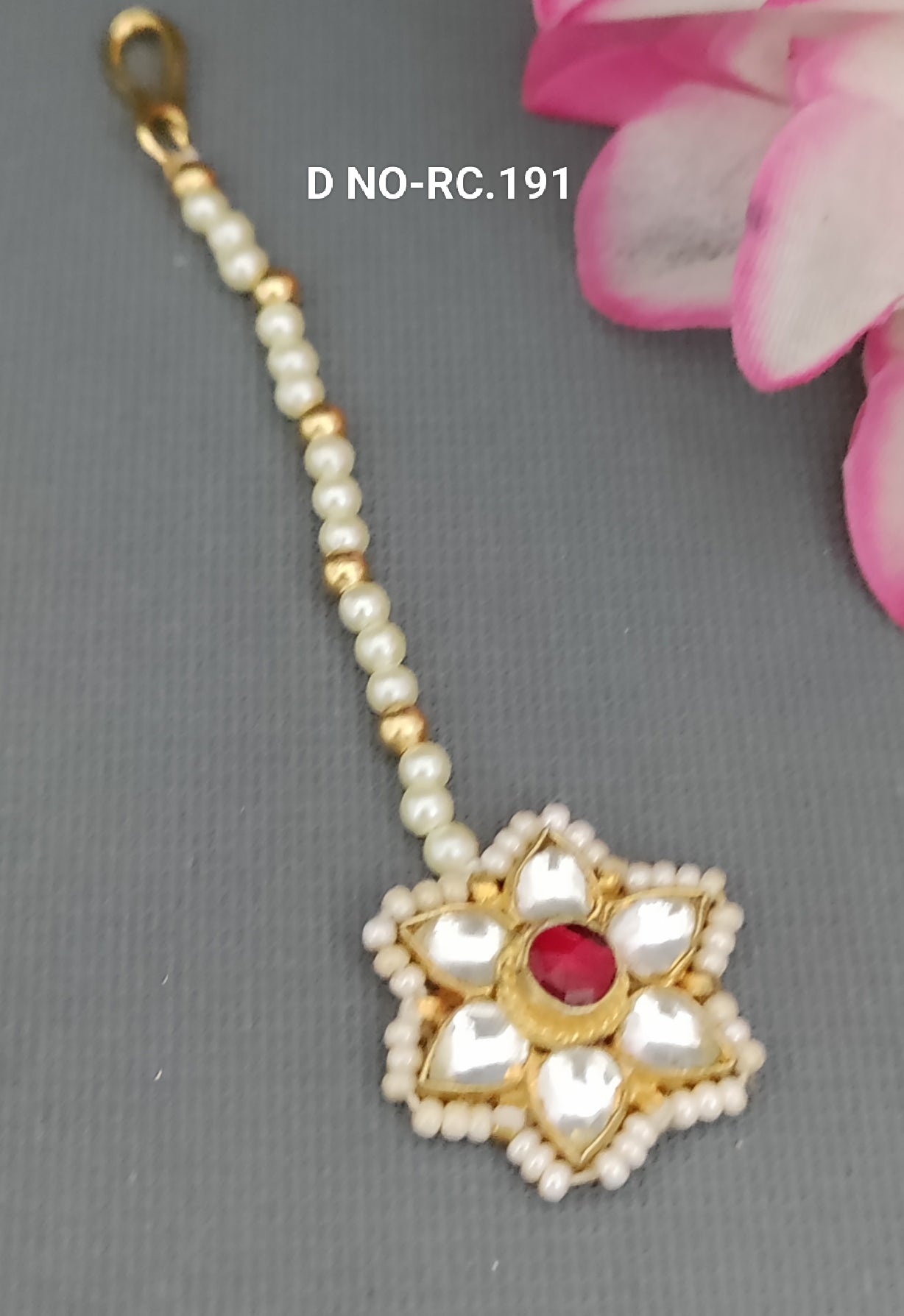 Elevate your traditional look with the Golden Kundan Tika SKU-RC.191, expertly crafted to add a regal touch to any ensemble. Featuring finely set kundan stones in a radiant golden setting, this tika combines classic elegance with enduring quality.