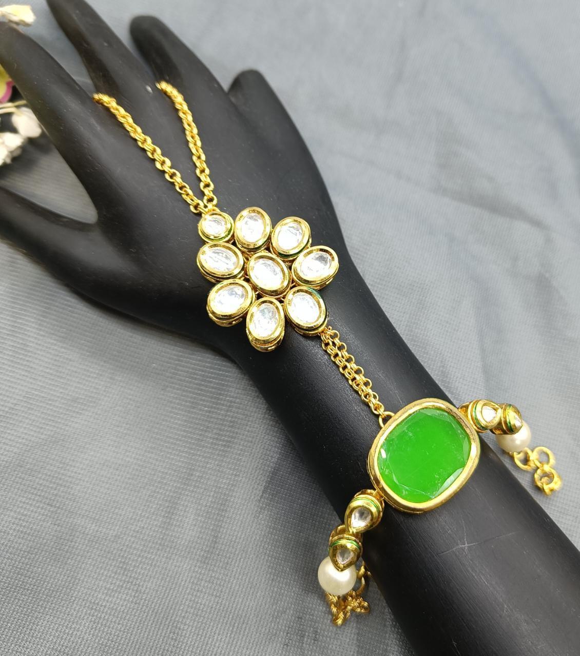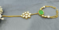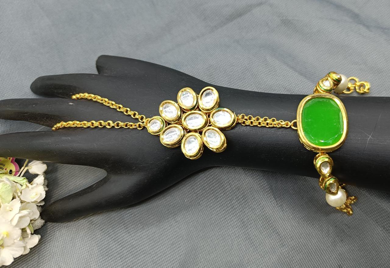 kundan polki Zircon style stone hand pieces with detailed dangling pearls. Fully adjustable ring and bracelet to fit most finger.