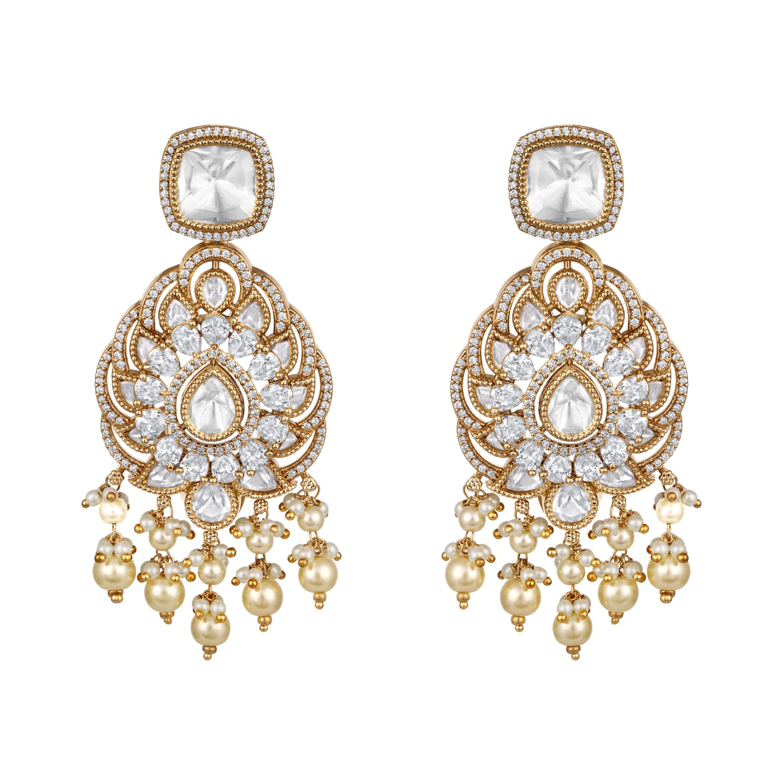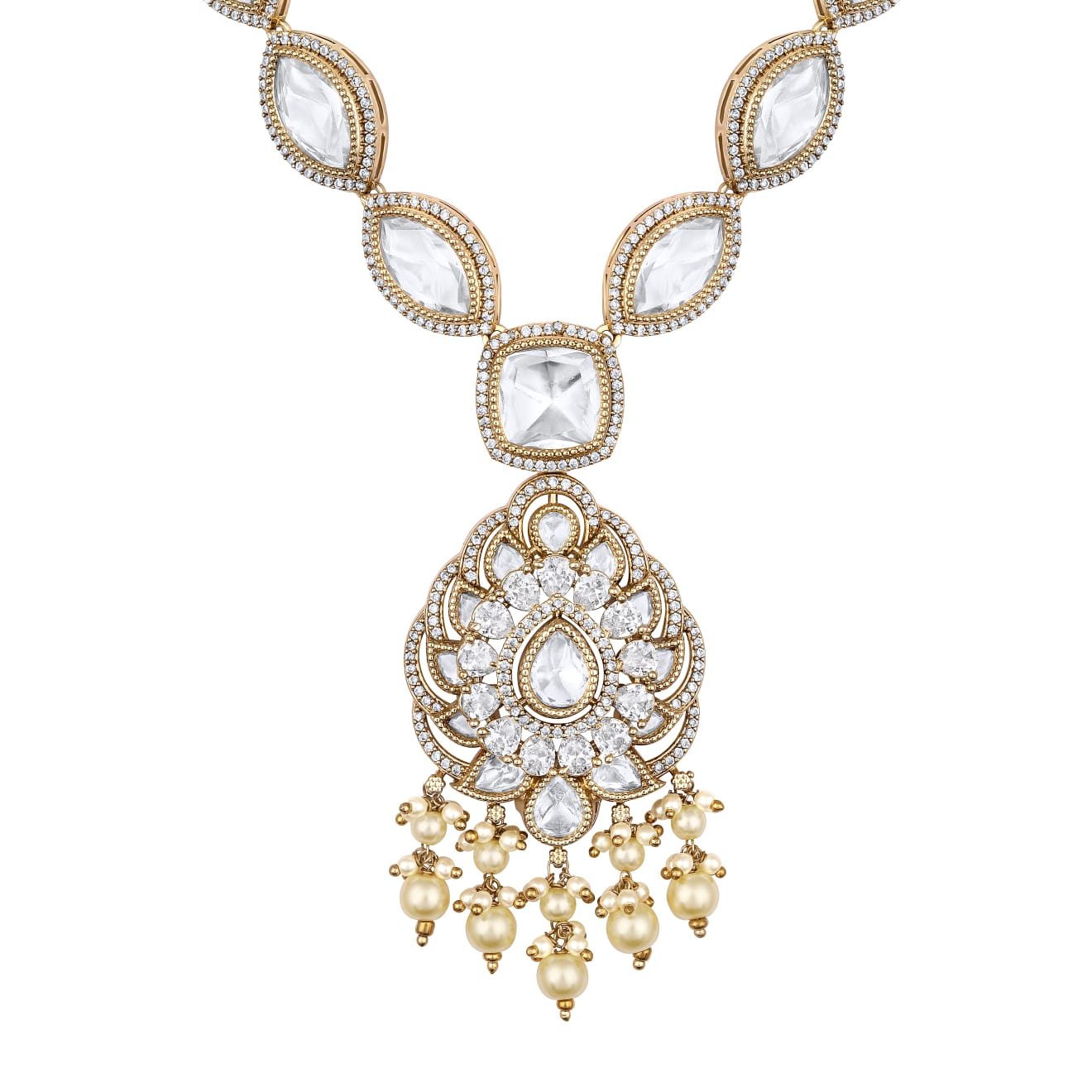 Mehandi Moissanite Kundan necklace set features a beautiful Mehandi design, adding a touch of elegance to any outfit. Crafted with high-quality moissanite, this necklace set offers a brilliant sparkle that mimics diamonds.