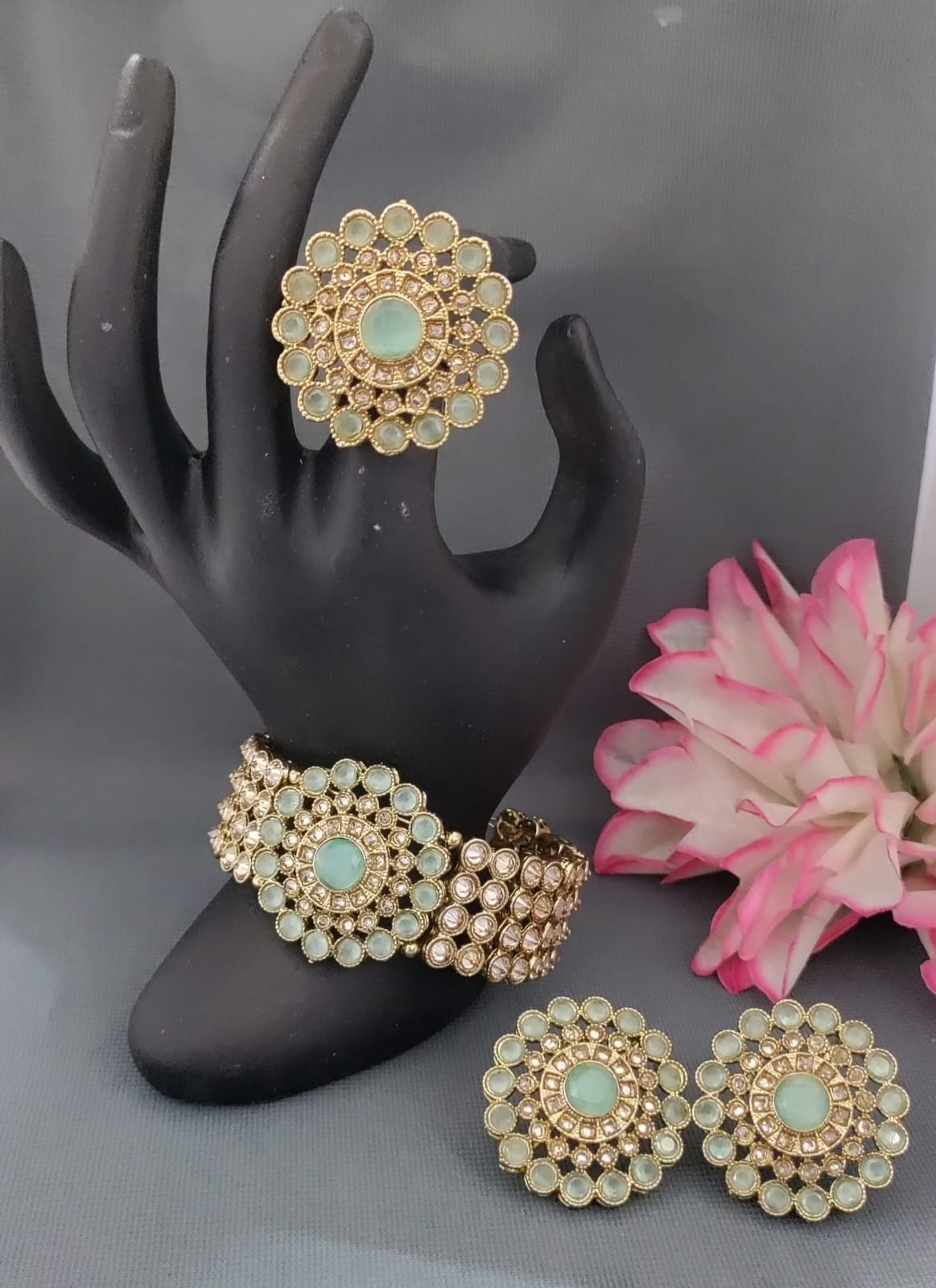 Experience the exquisite blend of traditional elegance and contemporary style with the Mehandi Polki Combo. This meticulously crafted set features authentic Polki stones arranged to enhance your festive and special occasion ensemble. Perfectly suited for those seeking timeless charm, this combo offers a refined touch that elevates your look with expert craftsmanship and intricate design. Ideal for weddings, celebrations, or cultural events, it promises both brilliance and lasting appeal.