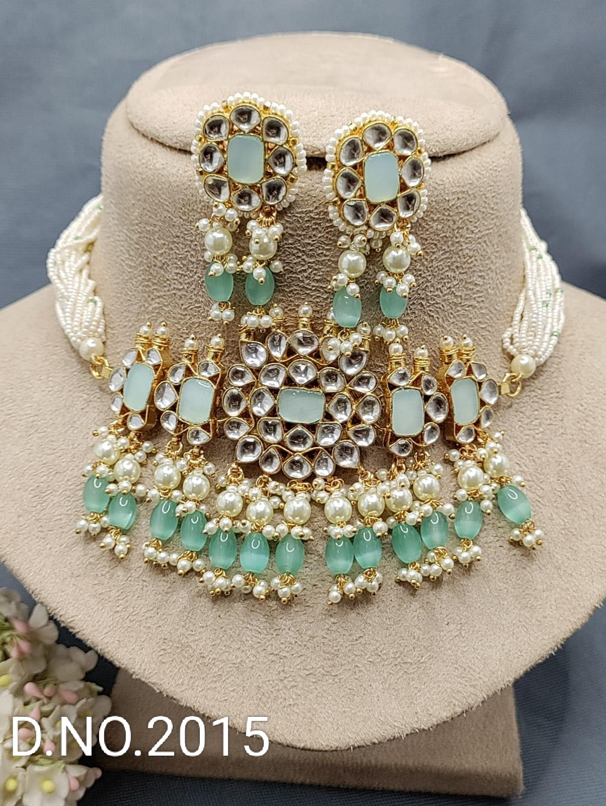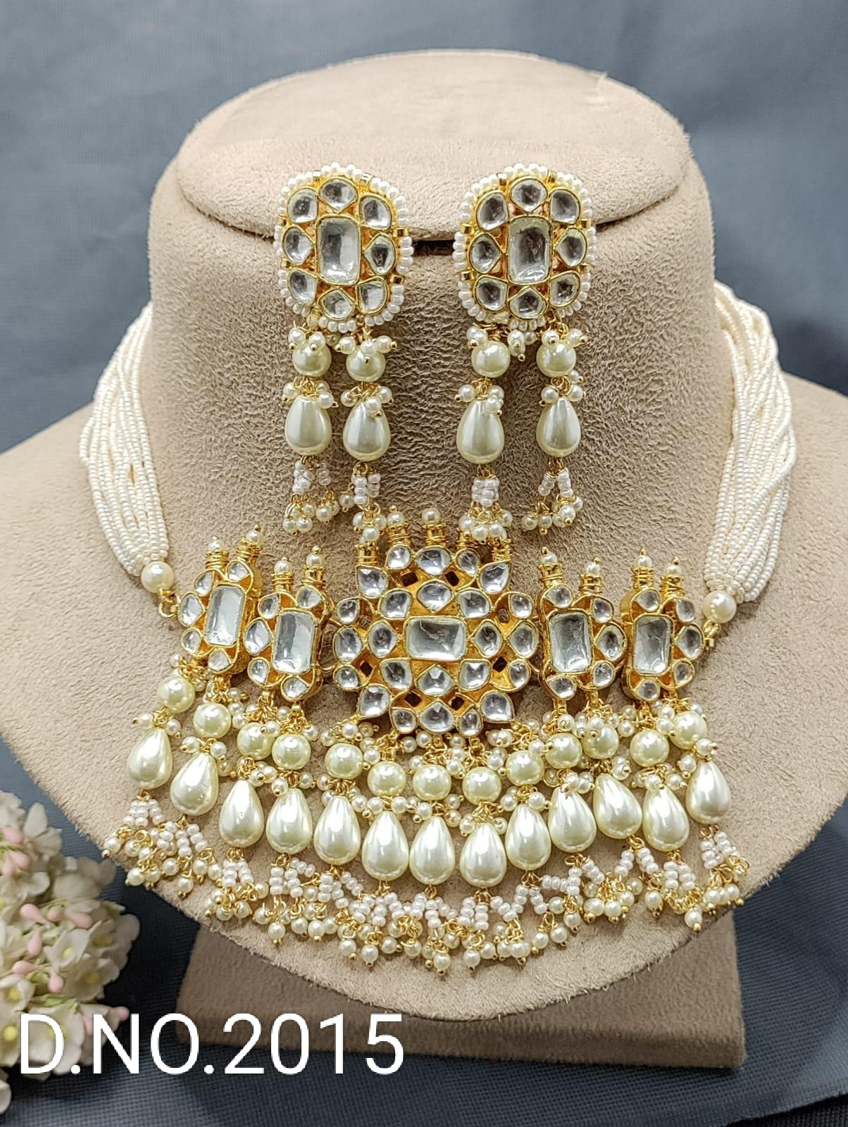 Pachi kundan necklace with earrings . pearl bead work. Thread gonda in necklace and Push back in Earings and very light weight.