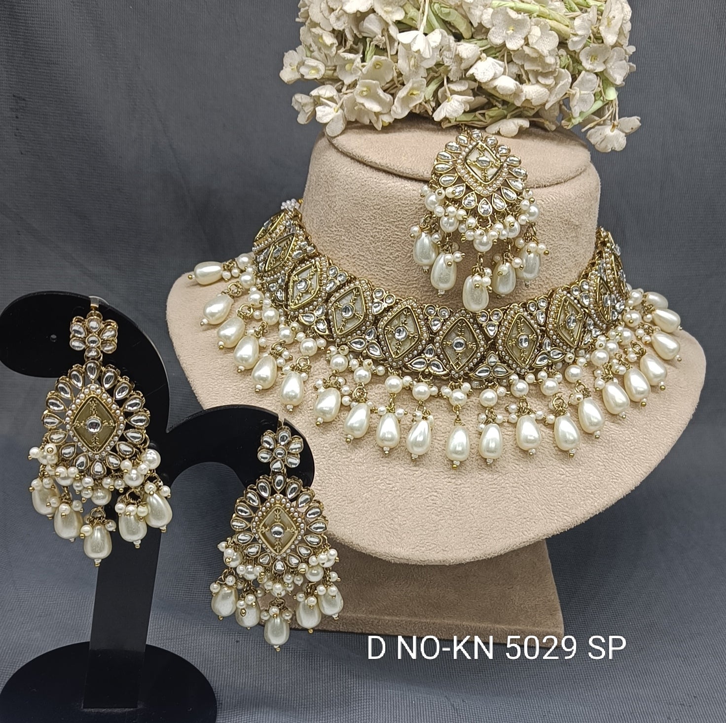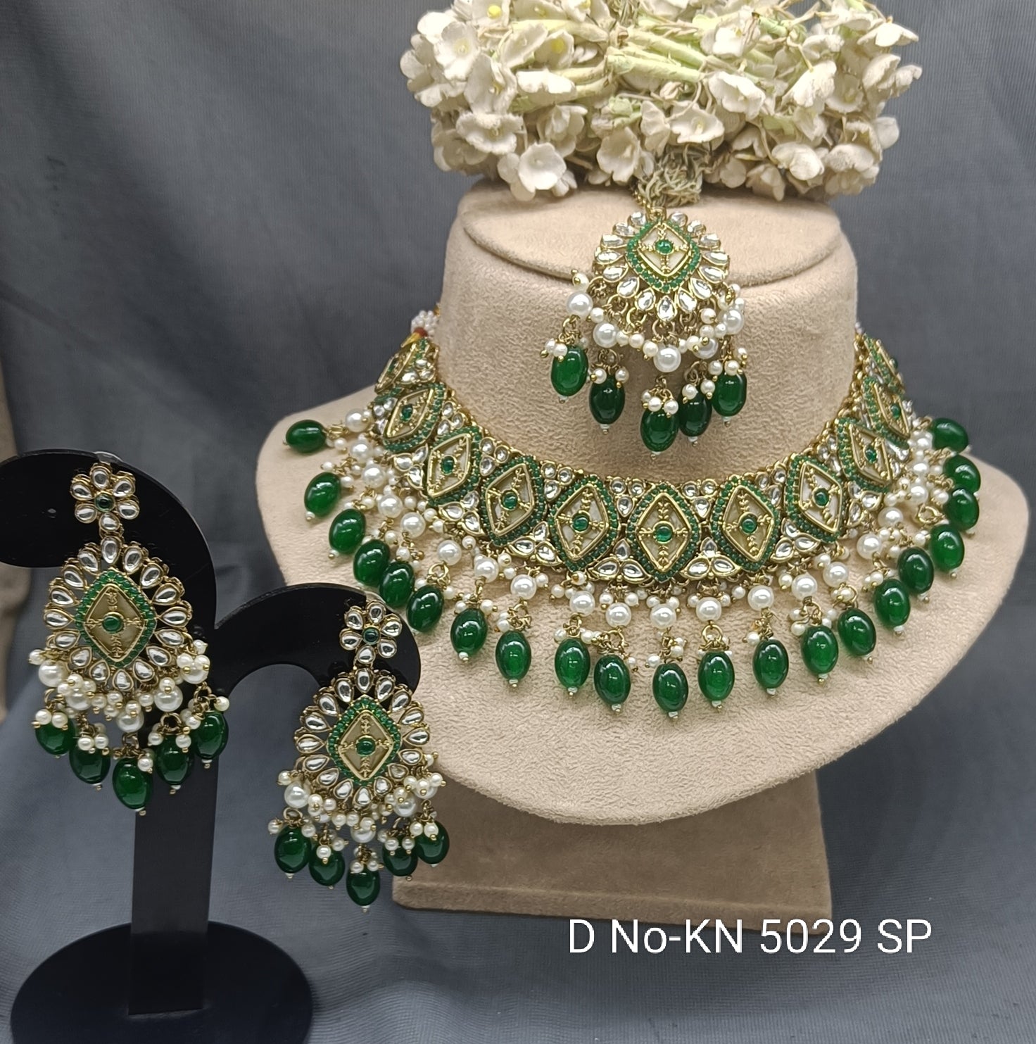 Pearl Kundan Mehandi Choker Necklace Set (SKU-KN 5029 The intricate kundan design adds an elegant touch to your attire. Perfect for brides or special occasions, this set will surely become a cherished addition to your jewelry collection.