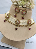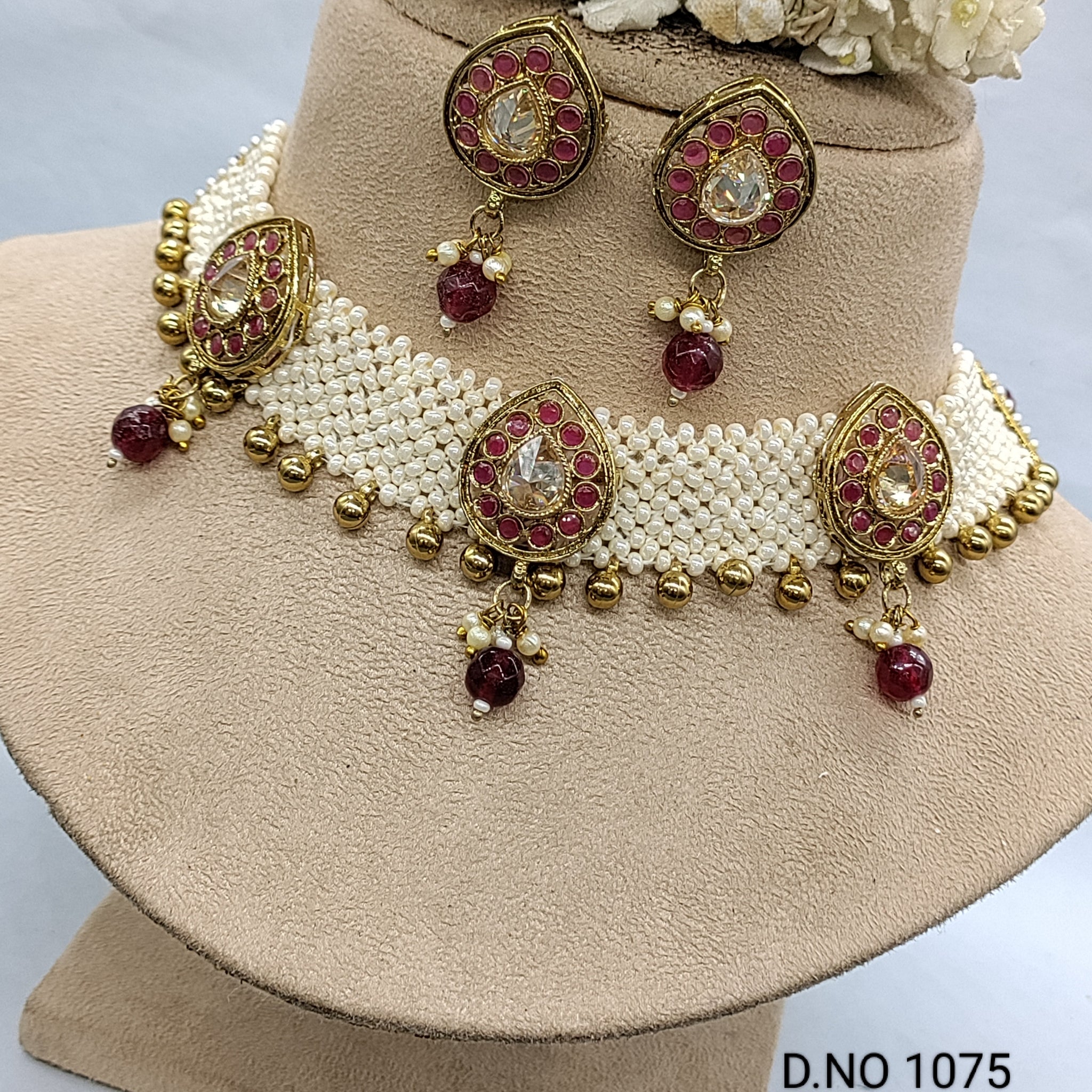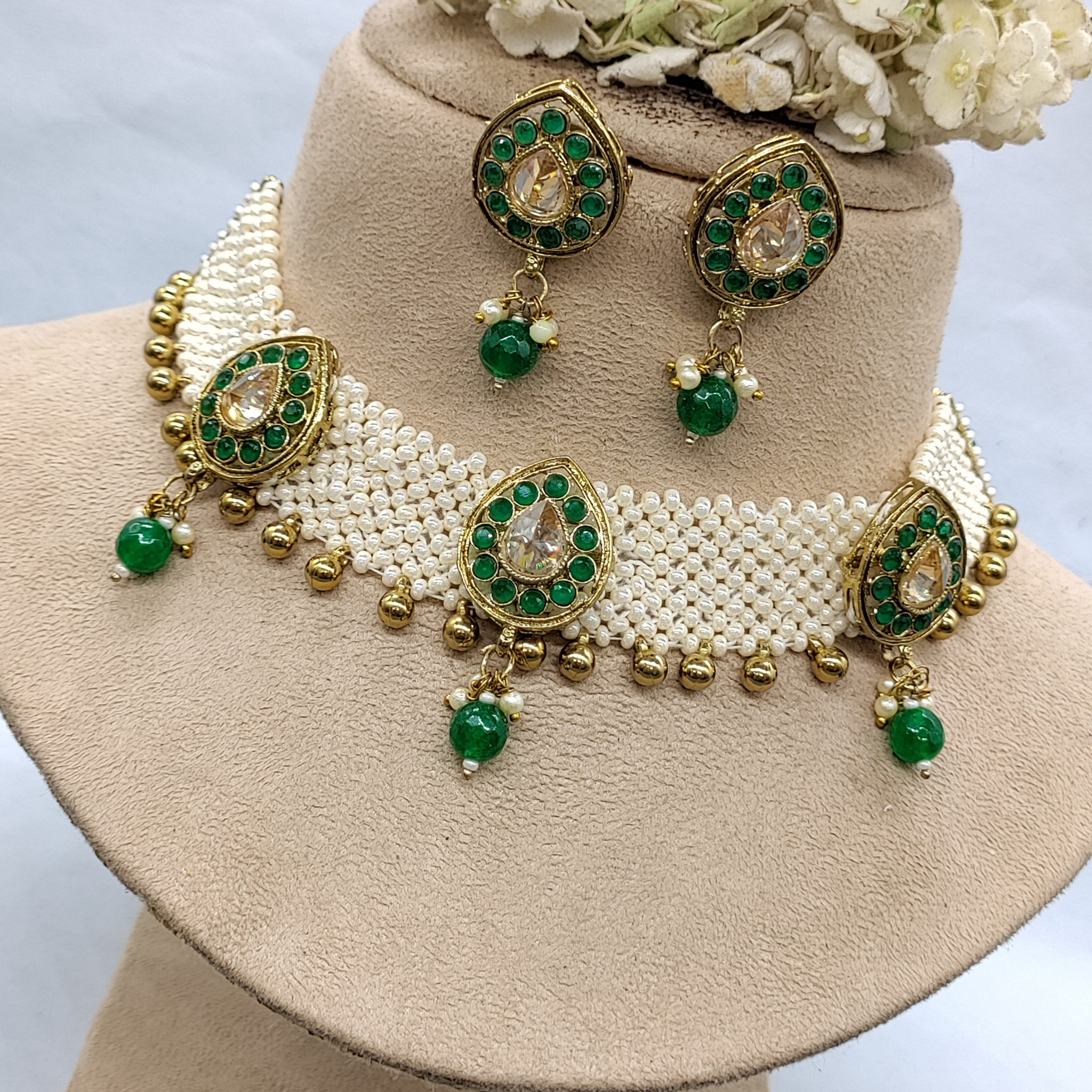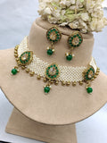 This choker necklace features lustrous pearls, adding a touch of elegance to any outfit. Expertly crafted in the Polki style, it effortlessly captures the beauty and tradition of Indian jewelry. Elevate your look with this timeless piece.