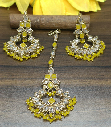 Polki Earring & Tica Mehndi set. Made with exquisite Polki stones and intricate Mehndi designs, this set is perfect for a touch of elegance and tradition. The perfect accessory for any occasion.