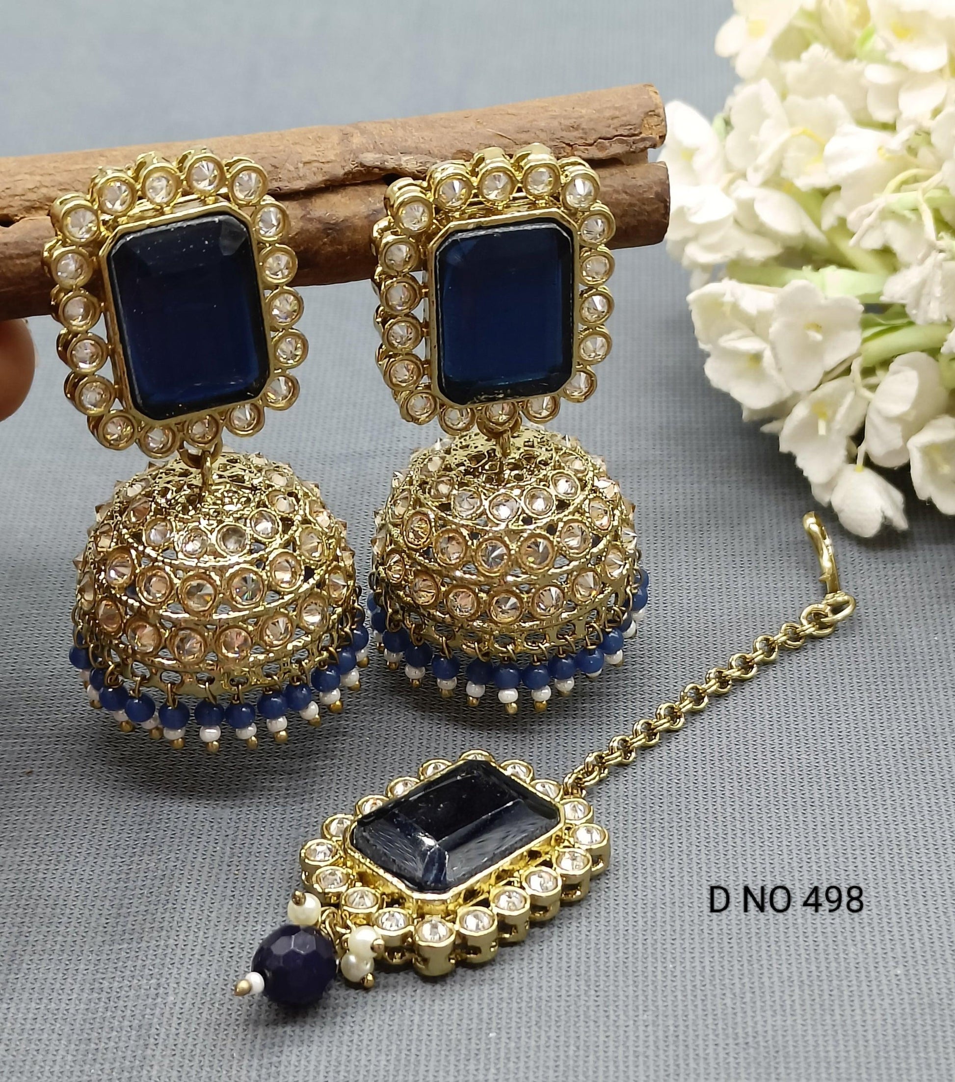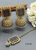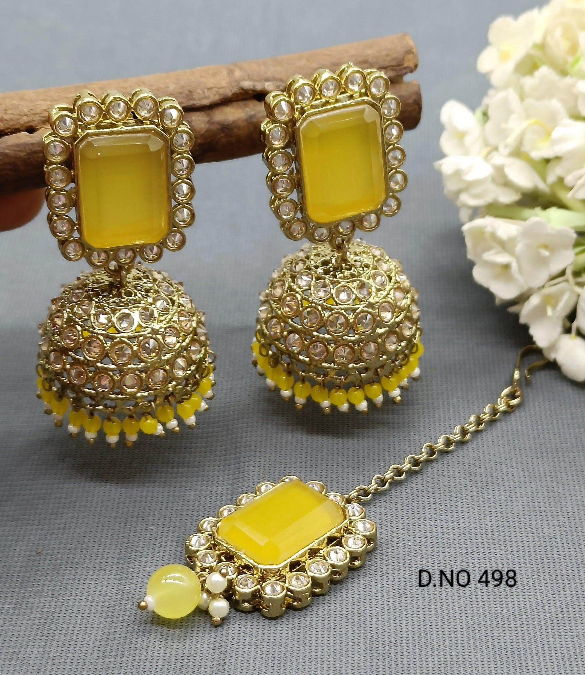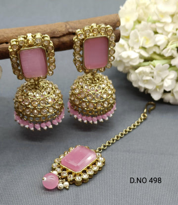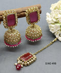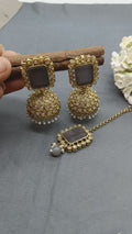 Polki jhumka Earring & Tica Mehndi set. Made with exquisite Polki stones and intricate Mehndi designs, this set is perfect for a touch of elegance and tradition. The perfect accessory for any occasion.