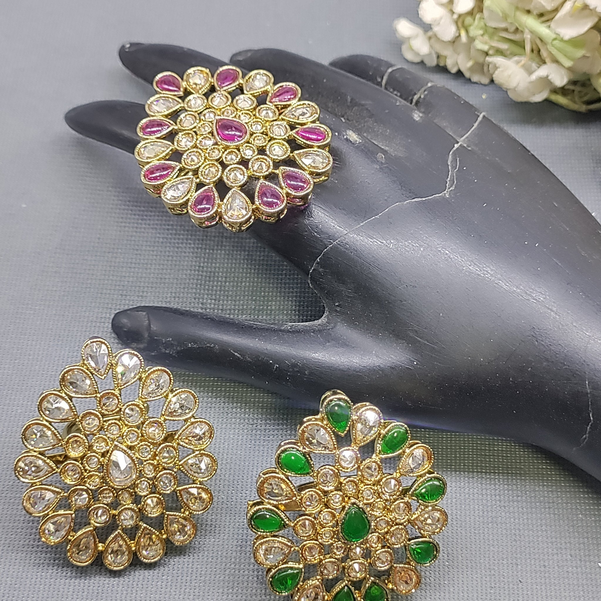 Experience the elegance of traditional Indian jewelry with our Polki Mehandi Finger Ring Combo. Made with authentic Polki Mehandi, this ring is a beautiful addition to any outfit. Adorn your fingers with this intricate design and let its cultural significance enhance your style.(Pack Of 3 pcs)