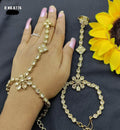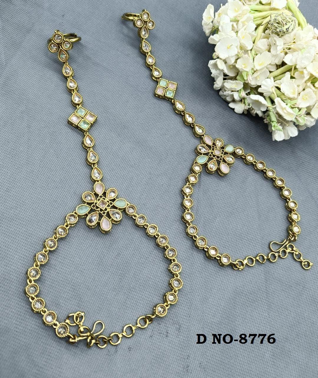 Pair of antique golden polki Zircon style stone hand pieces with detailed dangling pearls. Fully adjustable ring and bracelet to fit most finger.
