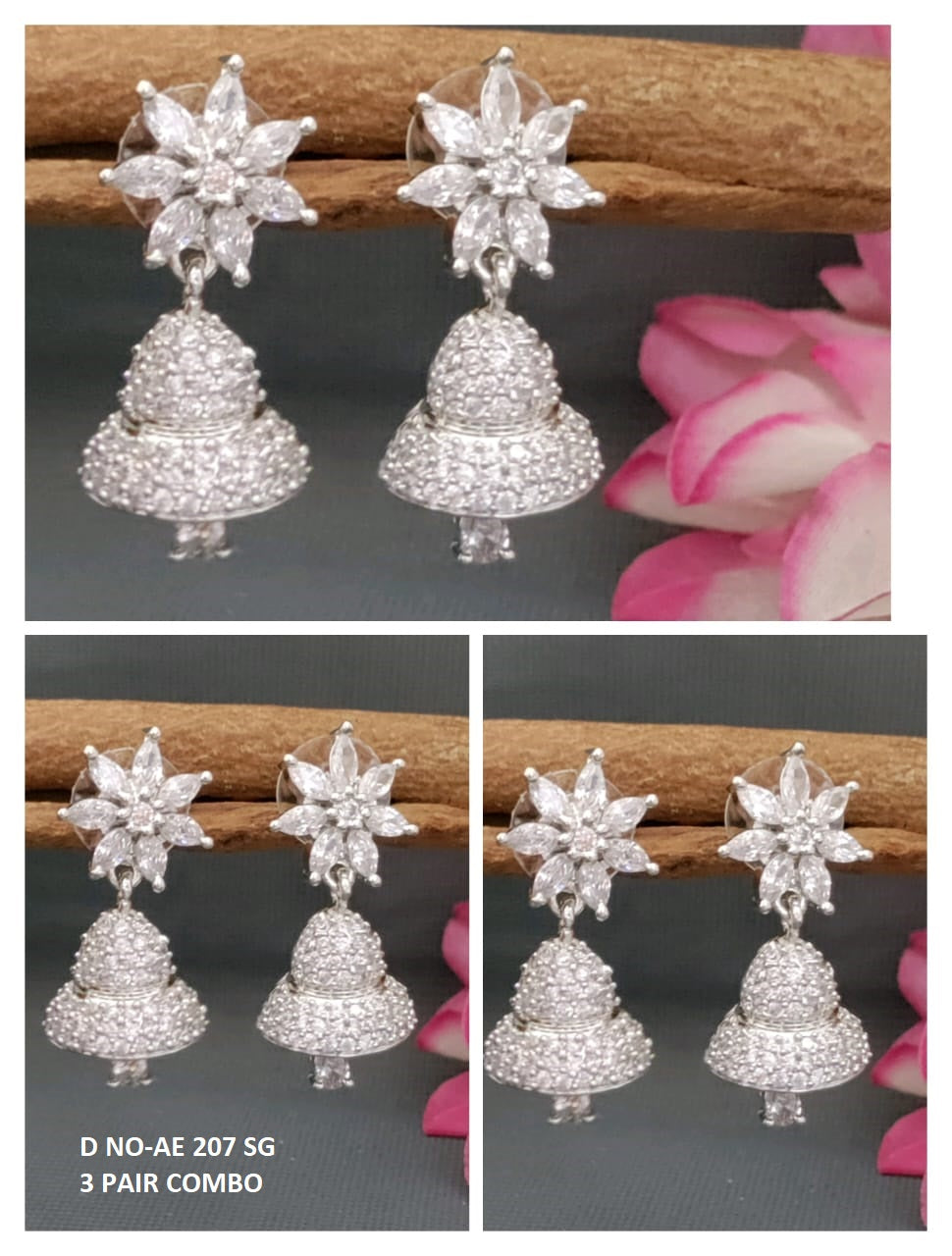 The Cz Ad Earrings Jhumki Rodium AE 207 SG are an elegant addition to any outfit. Crafted with high-quality cz ad stones, these jhumka earrings add a touch of sparkle and sophistication. With their delicate design and rhodium plating, they are the perfect choice for any special occasion or everyday wear. (PACK OF 3 PAIR COMBO)