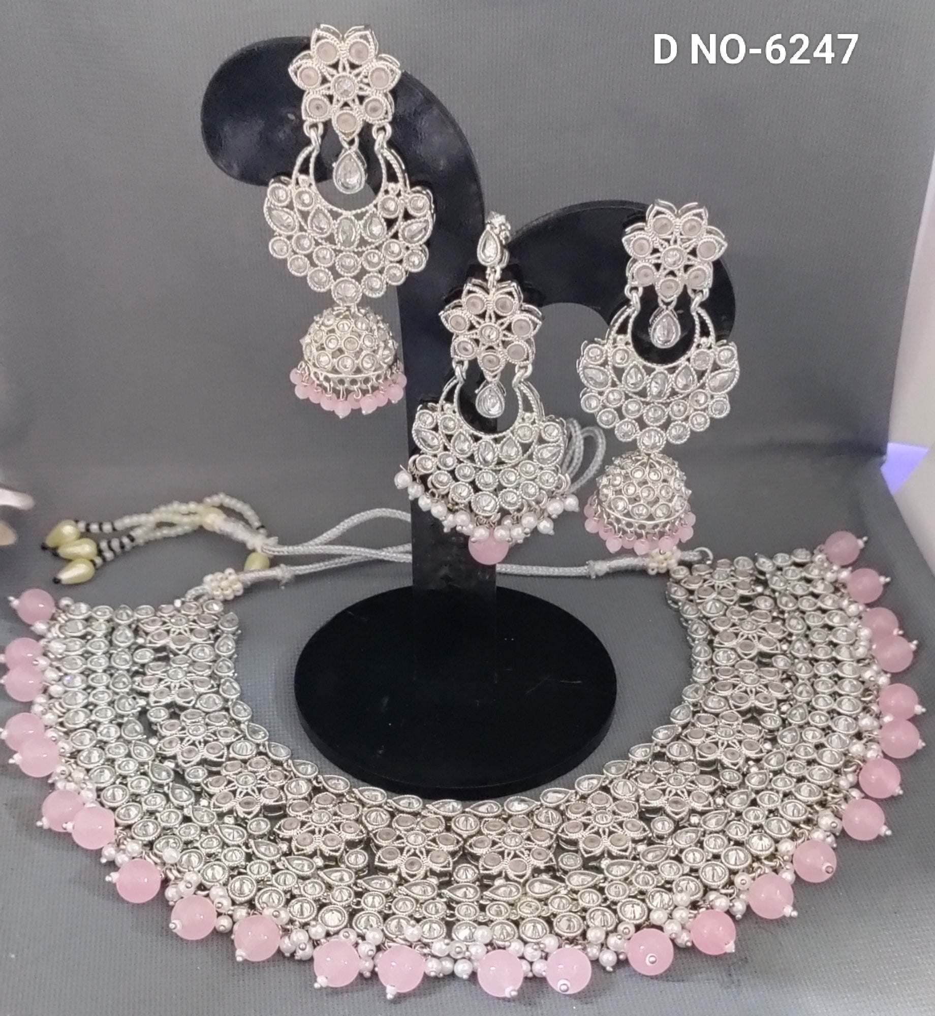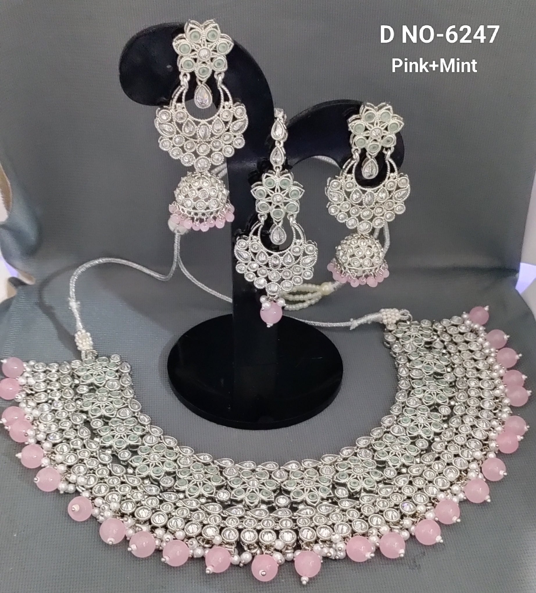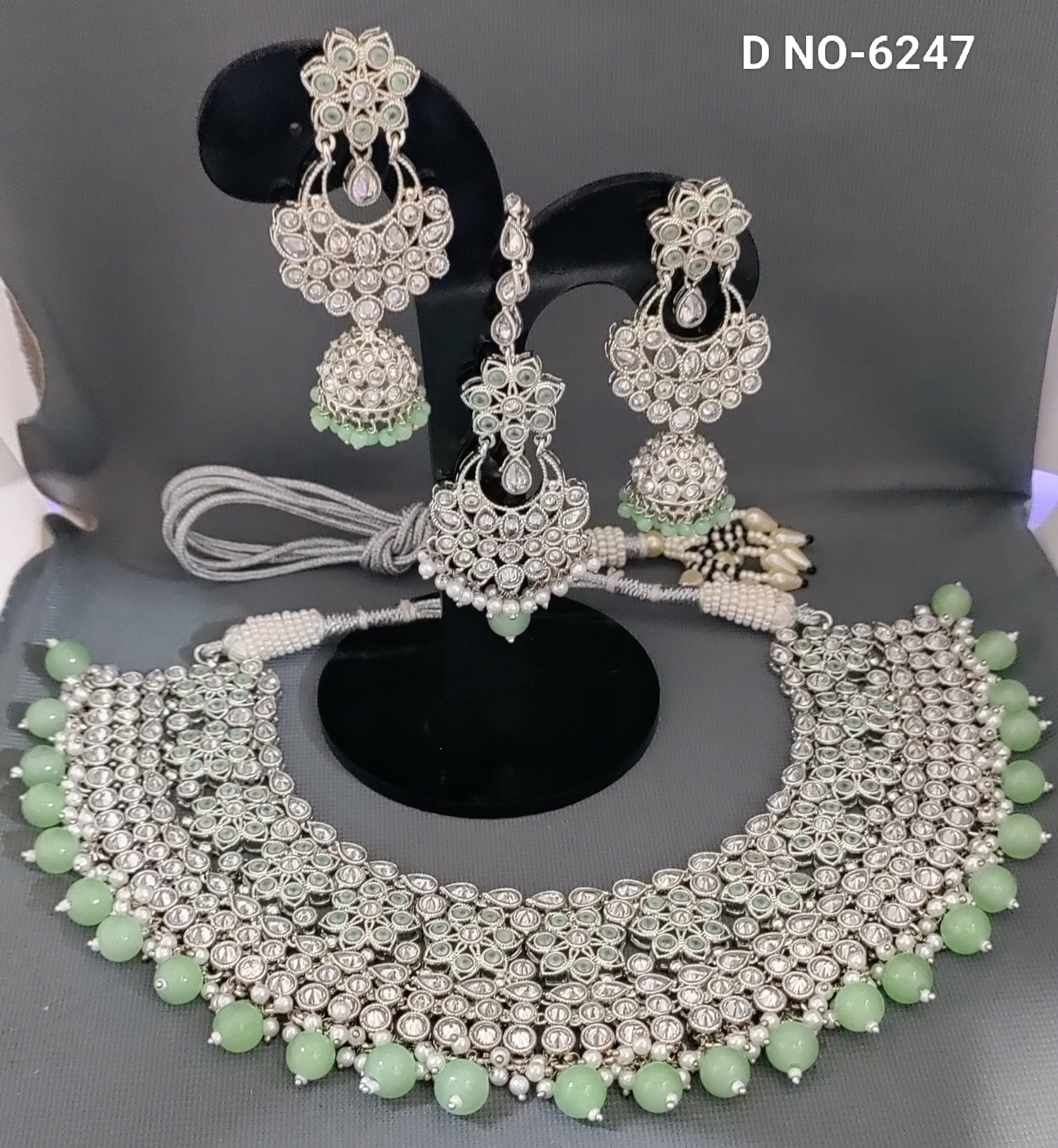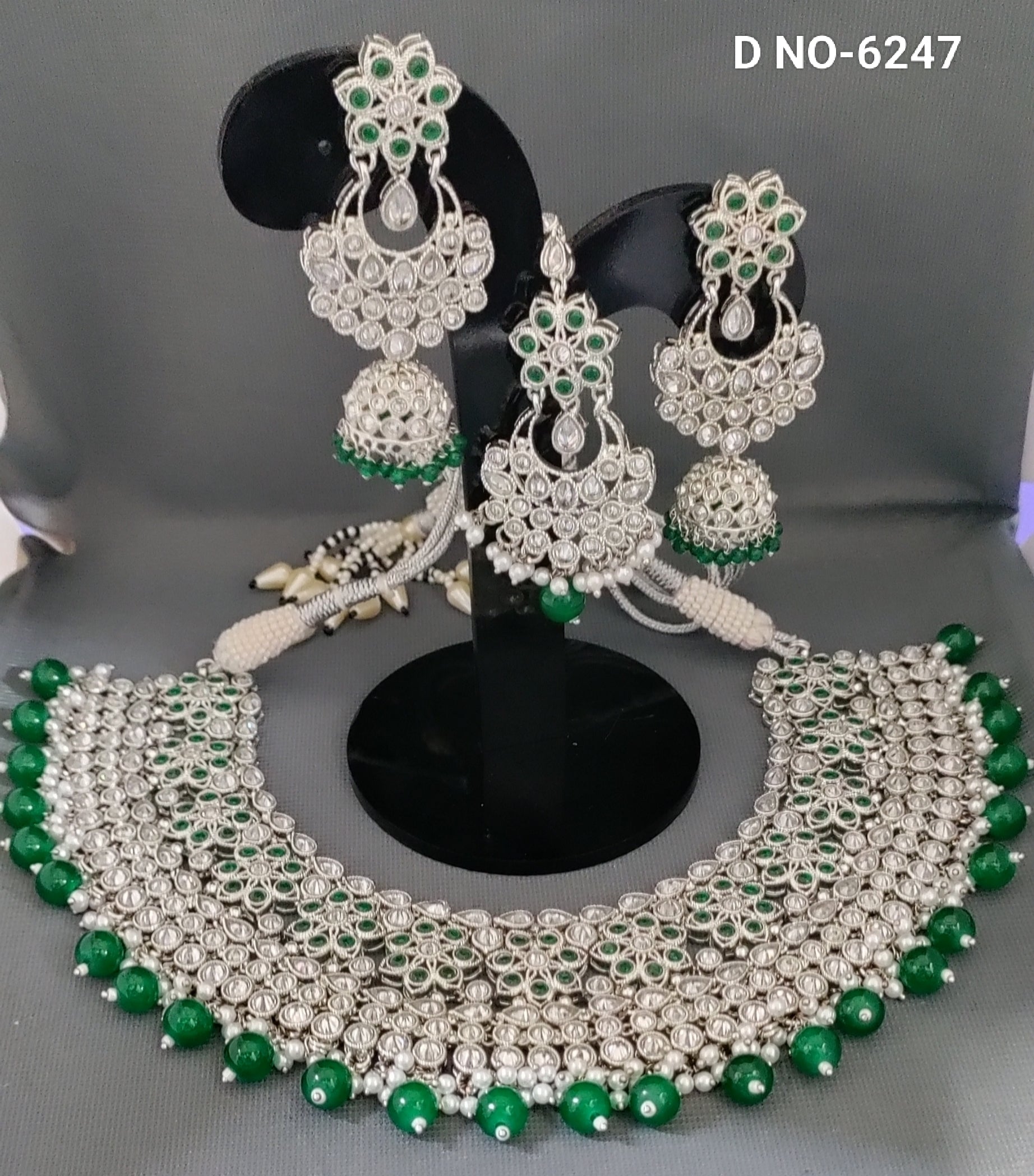 This Rodium Polki Necklace (Sku-6247) showcases refined craftsmanship with its durable rodium plating, ensuring lasting shine and resistance to tarnish. The intricate Polki design highlights traditional elegance, making it an ideal accessory for formal occasions or cultural celebrations. Its sophisticated finish enhances any outfit while offering comfort for extended wear. Perfect for those seeking a blend of timeless artistry and modern durability.