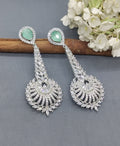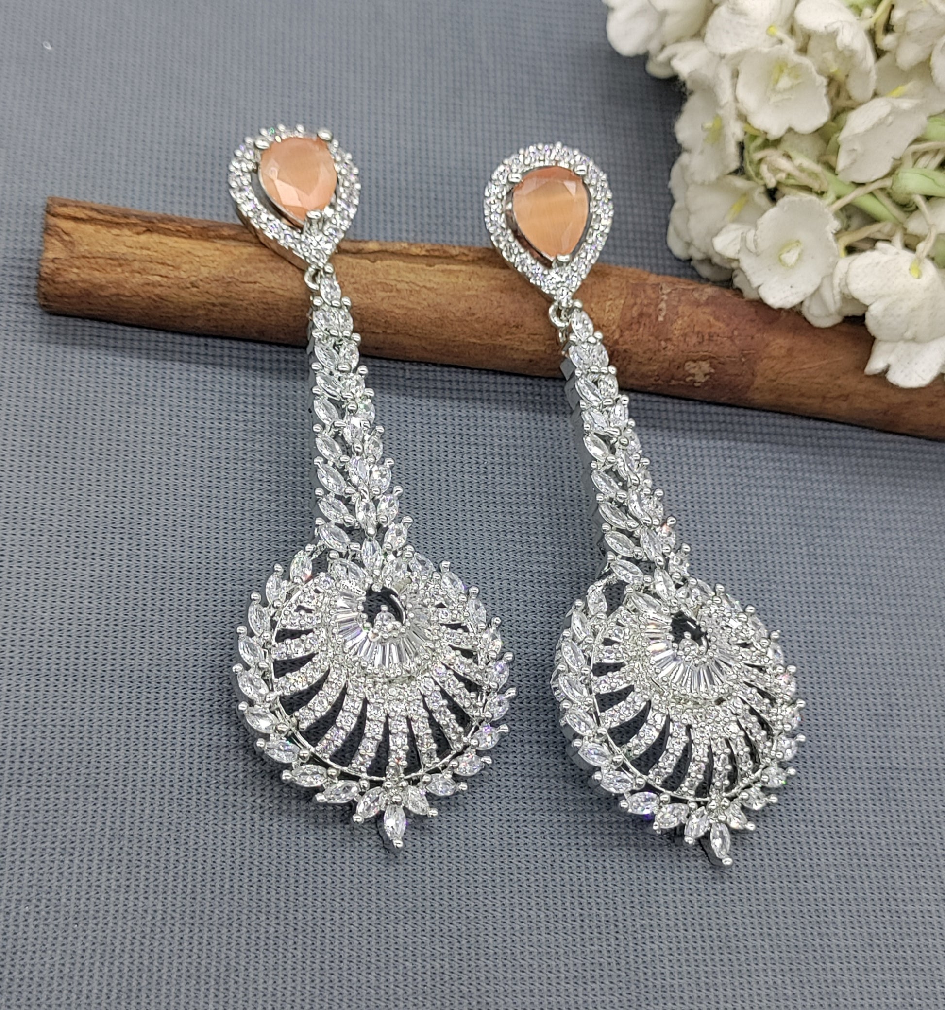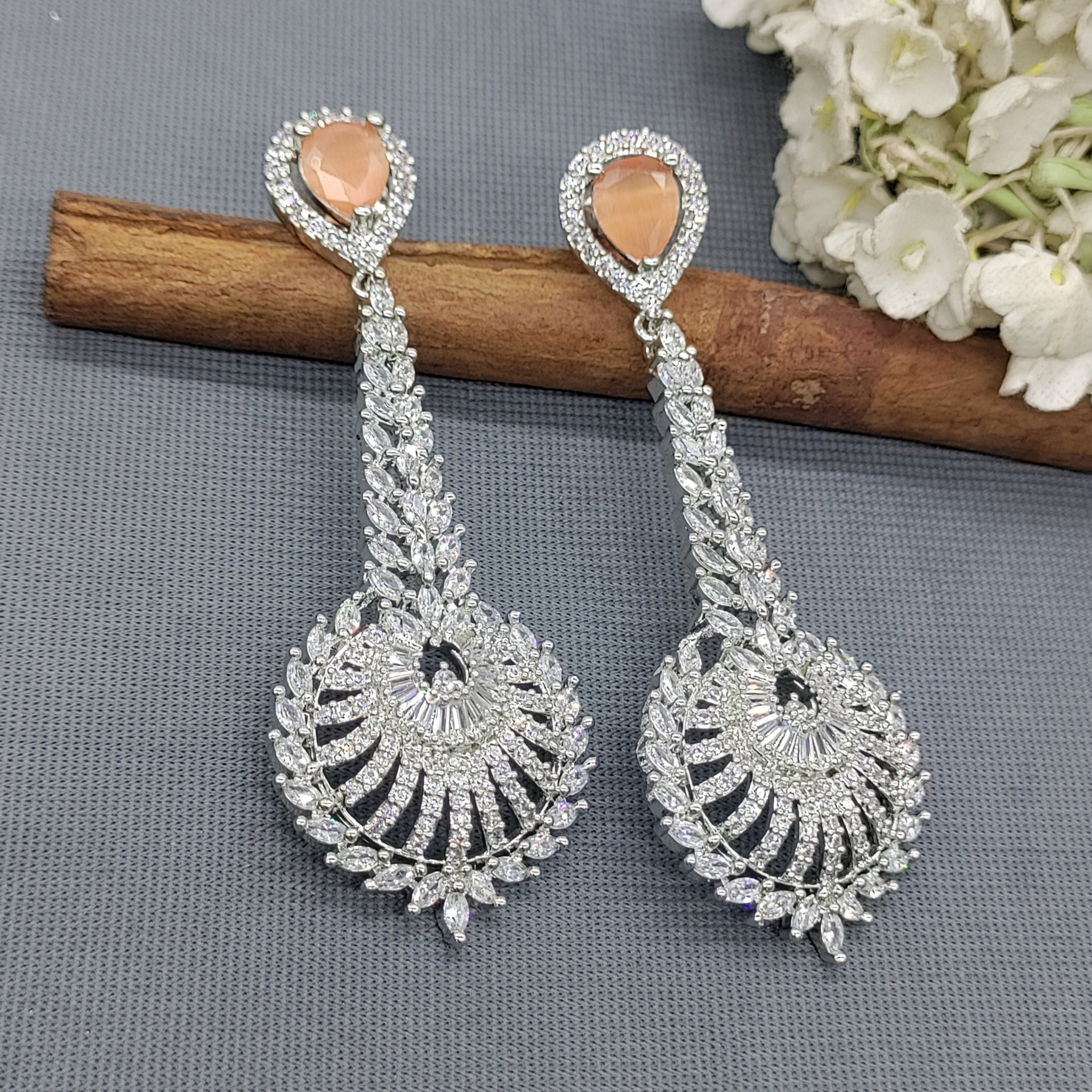 CZ Earring in Rodium, sku 438 C1. Featuring CZ accents, these long earrings add a touch of sparkle to any outfit. Perfect for special occasions or everyday wear, these earrings elevate your style with their sophisticated design.